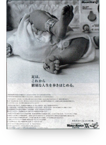 50,000km에 이르는 보행 검증 끝에 1987년에 탄생한 워킹화 ワールドマーチ[월드 마치]는 1997년에 일본 걷기협회 첫 공인을 취득하고, 견당사가 걸었던 여정을 따라가는 프로젝트 平成の遣唐使[헤이세이의 견당사] 오피셜 슈즈로 채용되어 라이센스 사업을 하였다. 1999년 平成の伊能忠敬・ニッポンを歩こう[헤이세이・ 이노우 타다요시 일본을 걷자] 협찬, 국제 매치 리그와 공식 후원 체결 일본의 대표 신발 브랜드로 자리 잡는 문스타
