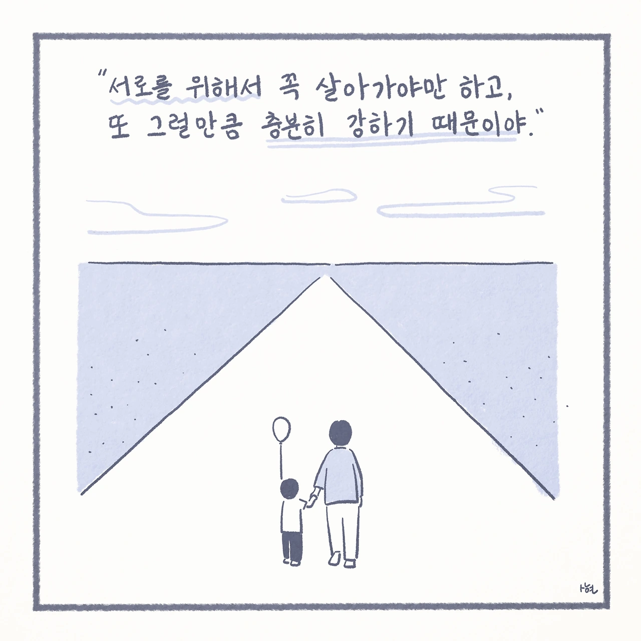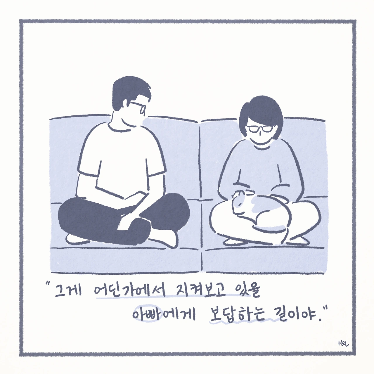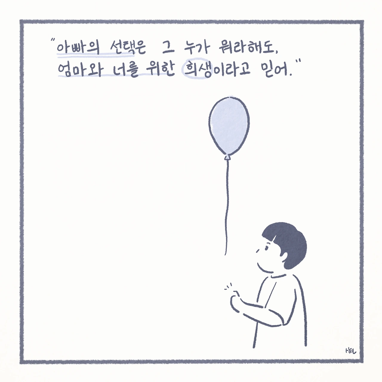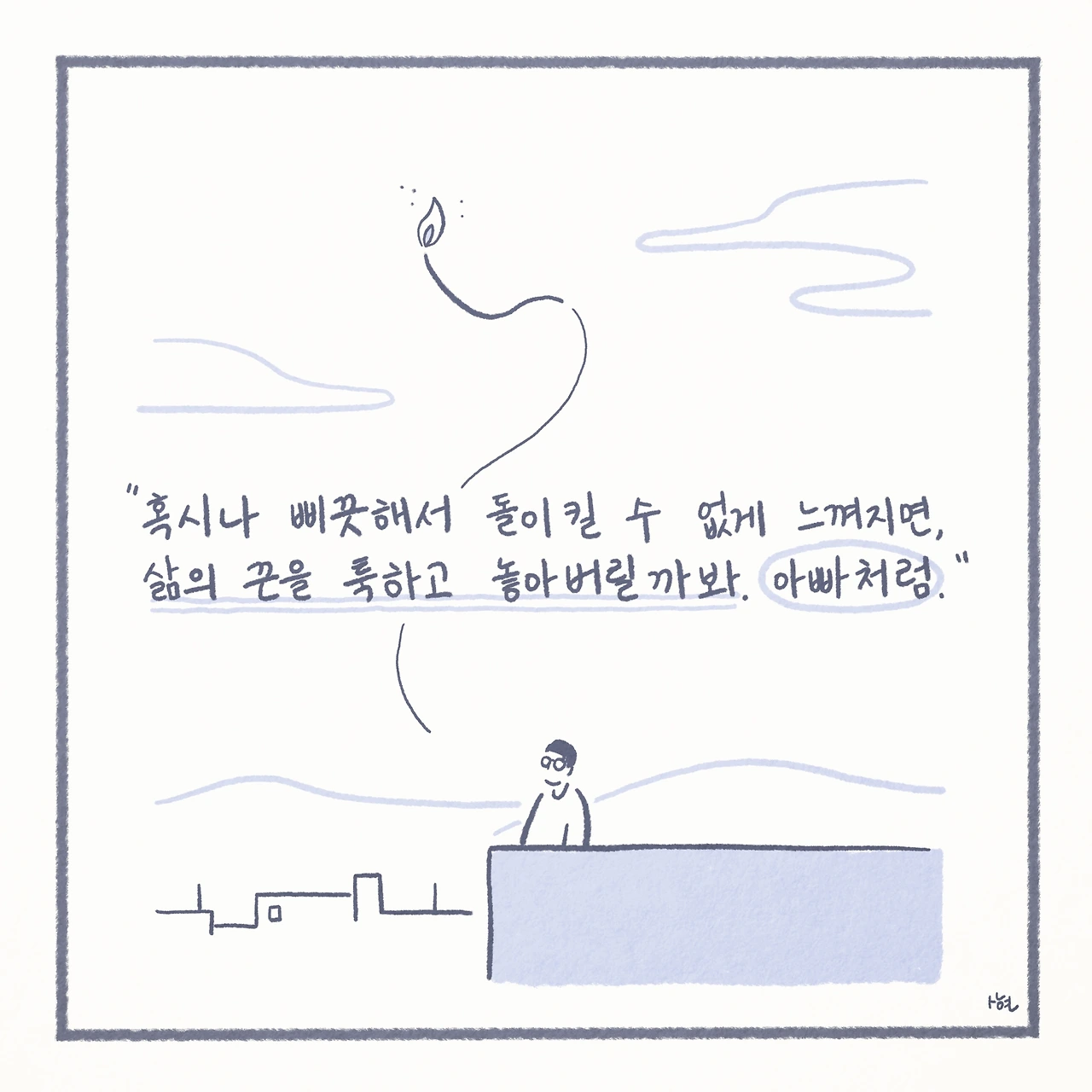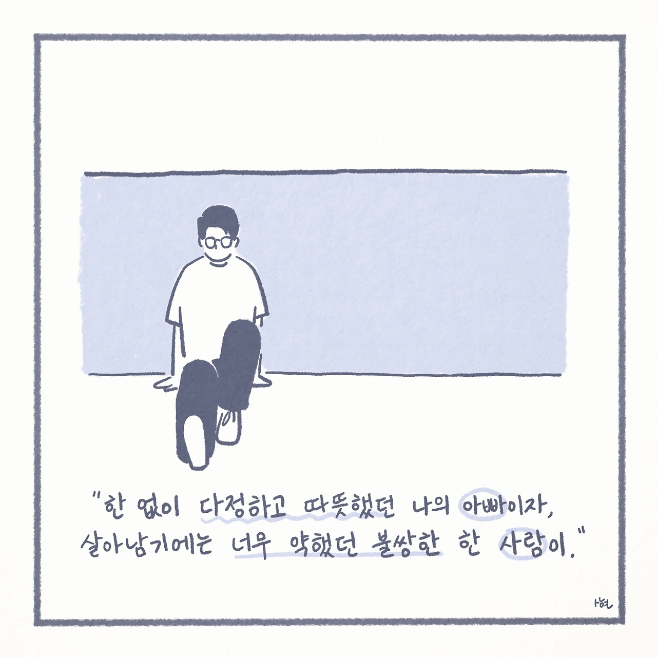 최근에서야 미디어에서 ‘자살 유가족’이라는 말을 접하면서, 남겨진 가족들이 평범하게 살아가는 것이 생각보다 그리 당연한 일은 아니라는 것을 깨닫게 되었다. 신기하게도 ‘자살 유가족’이라는 단어 하나만으로, 내 스스로 자책하며 살아왔던 그 간의 모든 것들을 타당한 것처럼 느끼게 만들었고, 생각 이상으로 어마어마한 위로를 받았다. 또한 이는 모두가 살아가며 지닌 보편적인 수 많은 고통 중에 하나일 뿐이었고, 나는 절대로 잘못된 것이 아니었다.
