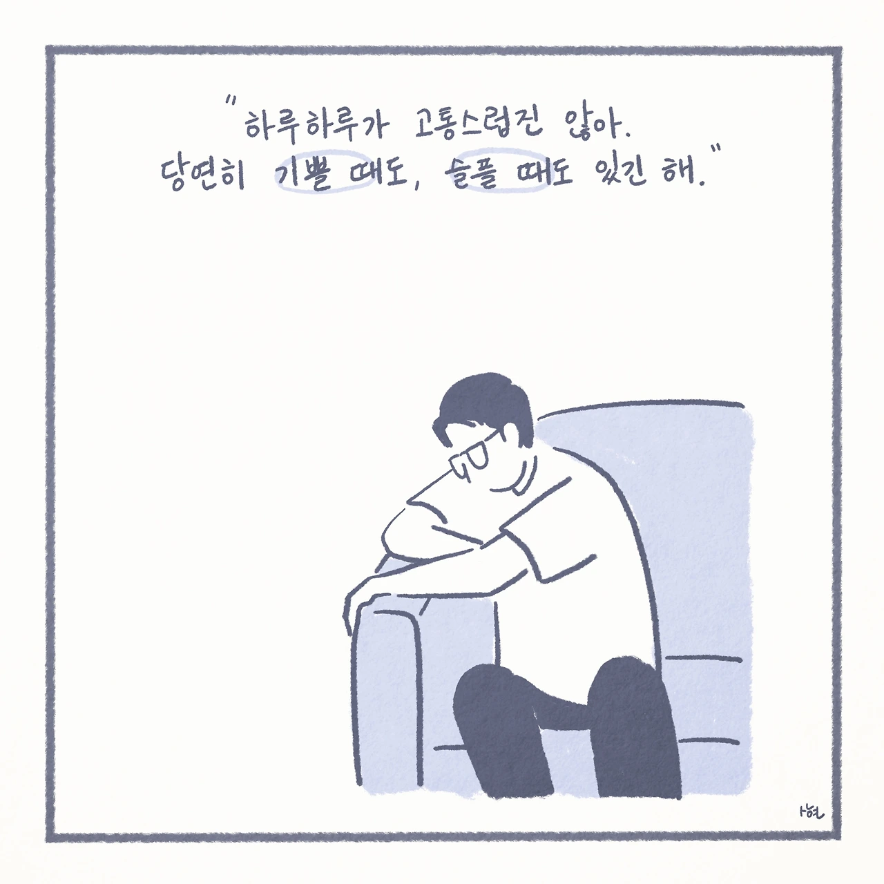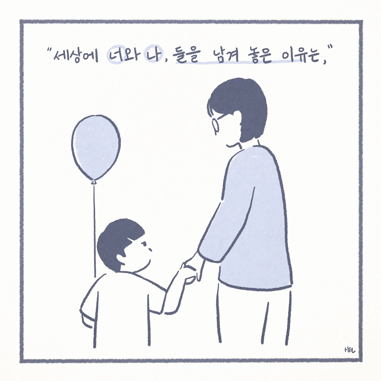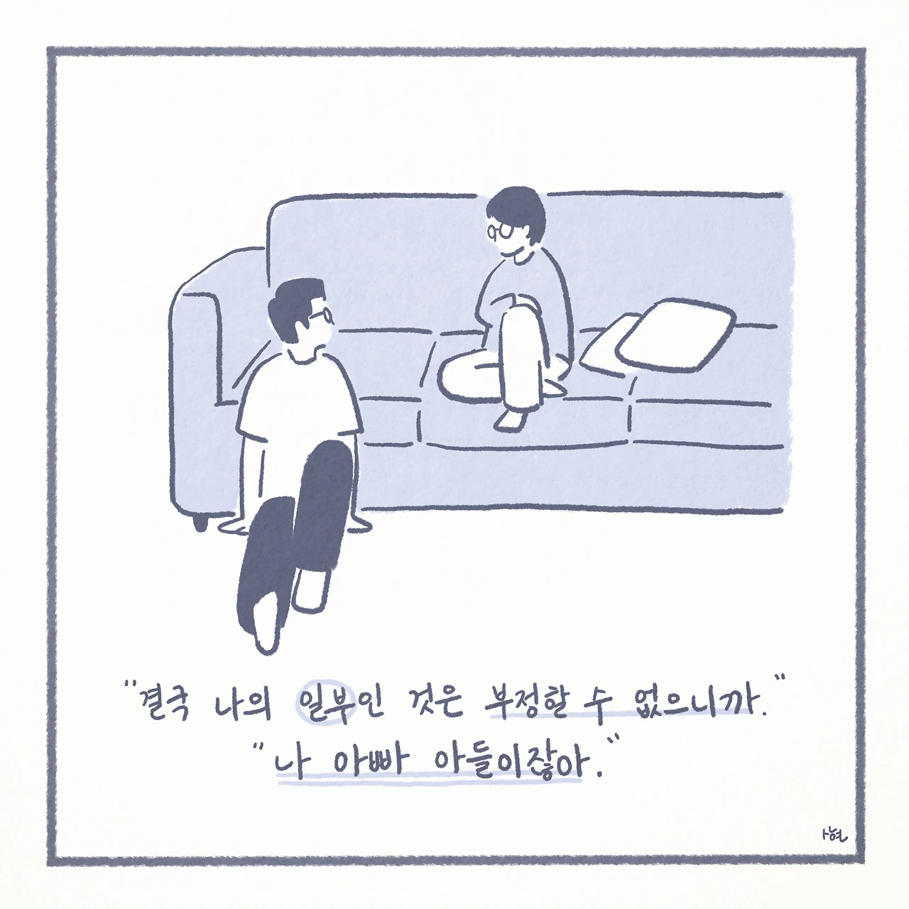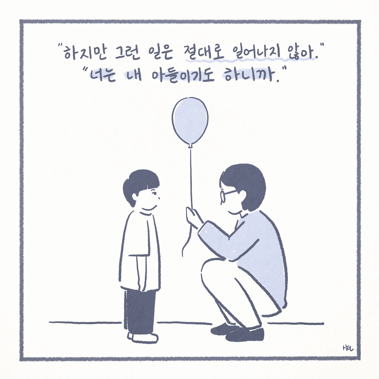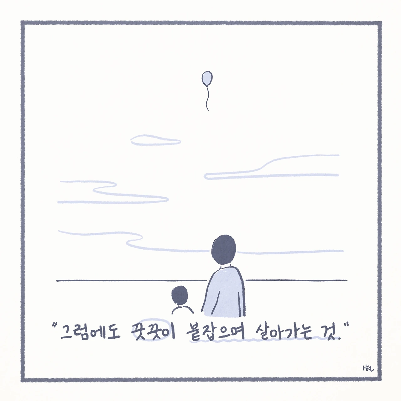 최근에서야 미디어에서 ‘자살 유가족’이라는 말을 접하면서, 남겨진 가족들이 평범하게 살아가는 것이 생각보다 그리 당연한 일은 아니라는 것을 깨닫게 되었다. 신기하게도 ‘자살 유가족’이라는 단어 하나만으로, 내 스스로 자책하며 살아왔던 그 간의 모든 것들을 타당한 것처럼 느끼게 만들었고, 생각 이상으로 어마어마한 위로를 받았다. 또한 이는 모두가 살아가며 지닌 보편적인 수 많은 고통 중에 하나일 뿐이었고, 나는 절대로 잘못된 것이 아니었다.