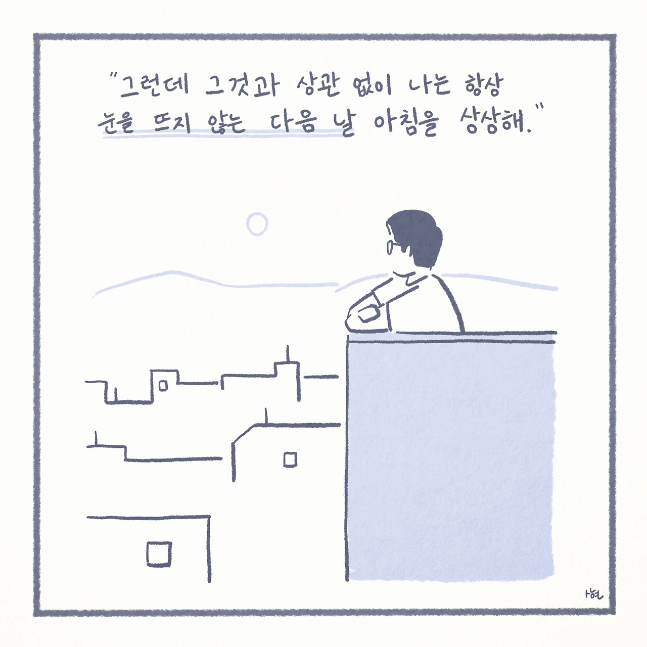 그렇게 자책은 지독하게 뻔한 습관이 되었다. ‘나는 가진 것도 없고, 타고난 것도 없어. 이대로 도태되면 나는 아무 것도 아닌 존재로, 조용히 사라져버릴지도 몰라.’라는 문장 속에 빠져 허우적거렸다. 사는 것 자체가 공포가 되어, 설령 보람찬 하루를 보내고, 설레는 다음 날이 기다리고 있다해도, 나는 매일 밤 눈을 감으며 눈을 뜨지 않는 다음 날 아침을 상상했다. 차마 스스로 놓아 버릴 수 없는 유일한 이유는 ‘엄마’뿐이었다.