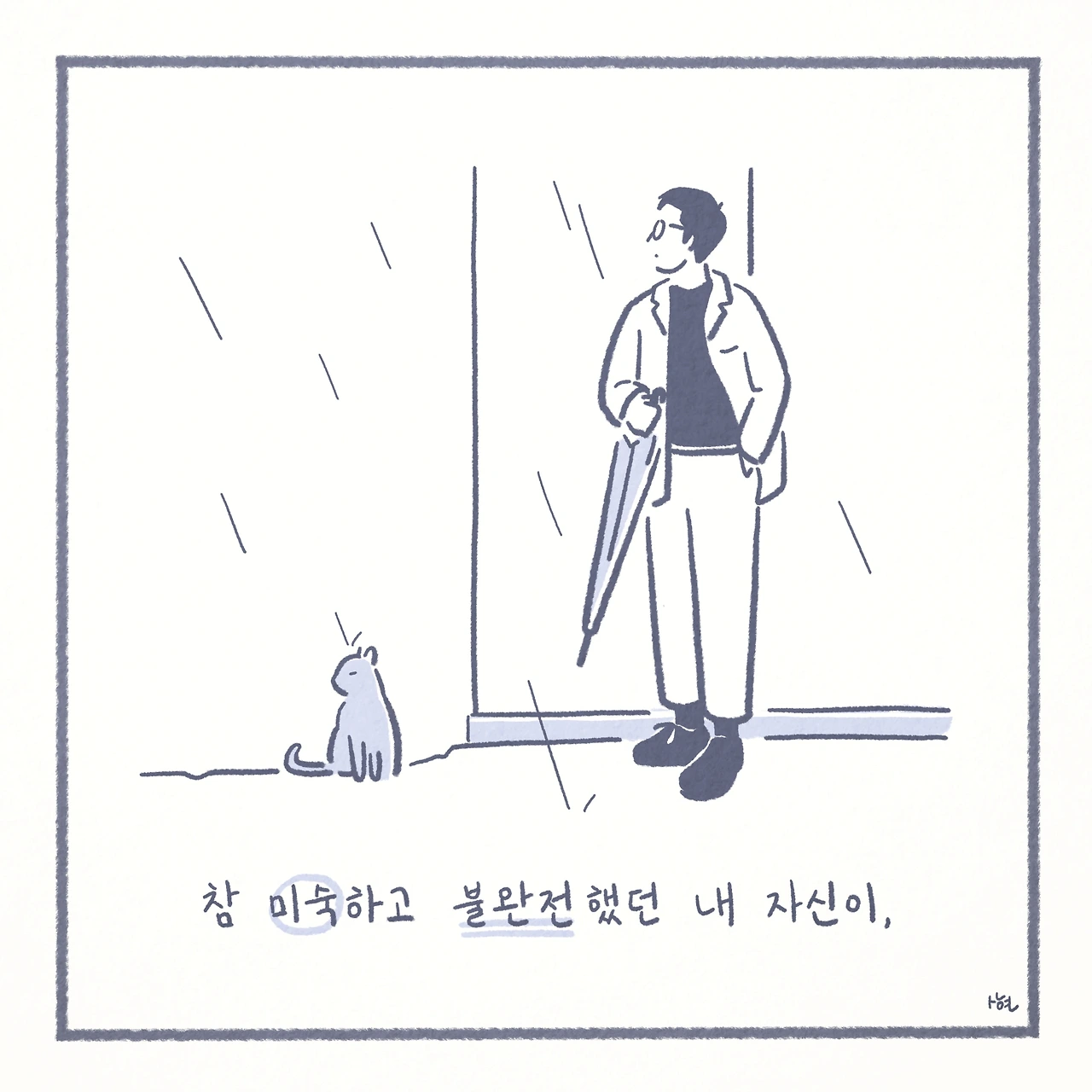 동네의 초록빛 풀 밭과 회색 길 위를 돌아다니면, 새까만 그림자가 돌아 다니듯, 사람들의 눈에 잘 띄었다. 그래서 혹시나 해코지를 당하지 않을까, 제대로 먹지 못하거나, 사고를 당하지는 않을까, 매번 걱정이 들었다. 동네 분들 모두 나와 비슷한 마음이었는지, 사료와 물이 담긴 플라스틱 용기들이 생겨나기 시작했다. 하지만 작은 생명체가 살아가기에 여전히 도시는 위험하고, 계절은 가혹하니, 걱정이 쉬이 줄어들지는 않았다.