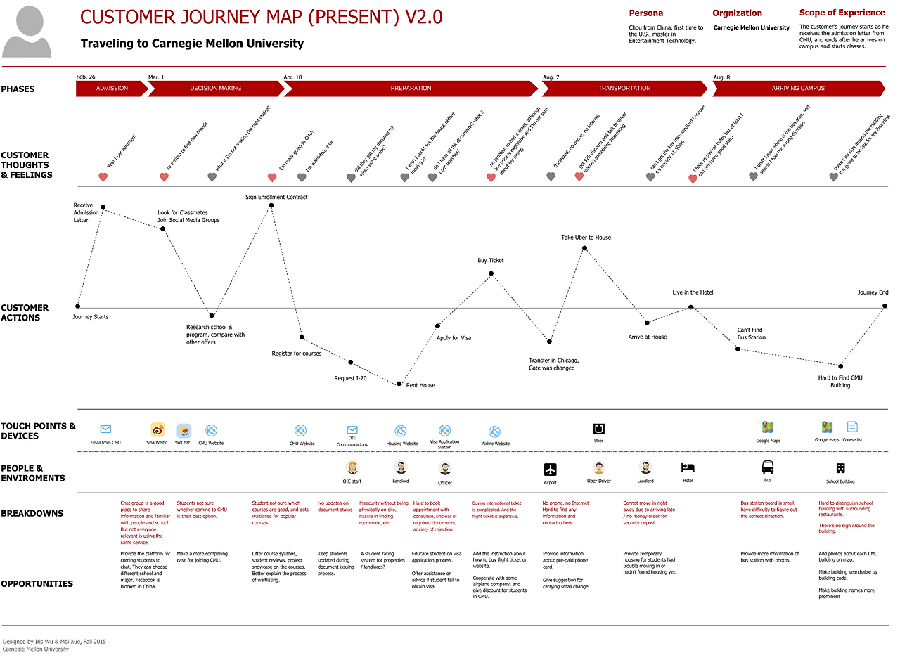 이런 면에서 서비스 디자인의 큰 특징 두 가지는 "무형성"과 "공급 라인을 포함한 디자인"이다. 무형성은 이제는 디자이너에게 그리 낯설지 않지만 제품디자인과의 비교할 때 더 드라마틱해진다. 올해 필자과 공동 작업을 한 스웨덴 IKEA 디자이너는 "In the end everything is service, not product" 라는 기치 아래 회사가 사운을 걸고 체질개선을 하고 있다 하였다. (IKEA가 말이다!) 이에 반해 공급 라인의 설계는 디자이너에게 훨씬 낯설고 어려운데 서비스 디자인 자체가 경영학의 Operations Research 에서 시발된 개념이라 포함된 듯 싶다. 따라서 서비스 디자이너는 고객이 서비스를 체감하는 접점 - touchpoint - 뒤의 공급 라인의 조직 보다는 그 경계 자체에 더 무게를 두게 된다. 이는 디자이너의 툴킷에 잘 드러나는데, 아래 그림은 Customer Journey Map으로서 고객이 각 touchpoint마다 시간에 따라 어떠한 상황인지를 파악하여 디자이너가 여러 개선/기회 요소를 도출하도록 도와준다.