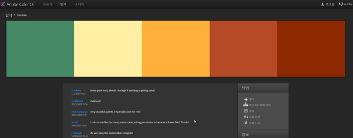 그림 2. Adobe Kuler에 제시된 배색 하나색채 연구자들은 이 문제를 해결하기 위해 단순하고도 효과적인 방법을 사용했다. 그것은 바로 설문조사로서 여러 (배)색을 제시하고 여러 감성 어휘가 '얼마나 느껴지는지' 를 수집하는 것이다. 이 데이터는 요인 분석이나 차원 축소를 통해 위 그림1의 왼쪽 책자와 같은 2차원상의 감성-배색맵으로 요약된다. 인터넷이 등장하면서 새로 등장한 방법은 사람들로 하여금 색과 감성을 스스로 제시하고 공감하는 것에 '좋아요'를 누를 수 있게 한 것인데, 대상색 뿐만 아니라 태깅된 감성어들이 훨씬 다양해지게 되며 설문에 참여하는 참여자들의 수 또한 비교할 수 없다. 위 그림 2의 예시가 도대체 어떤 감성을 의도한건지 한 번 맞춰보도록 하자. (정답: 피렌체)