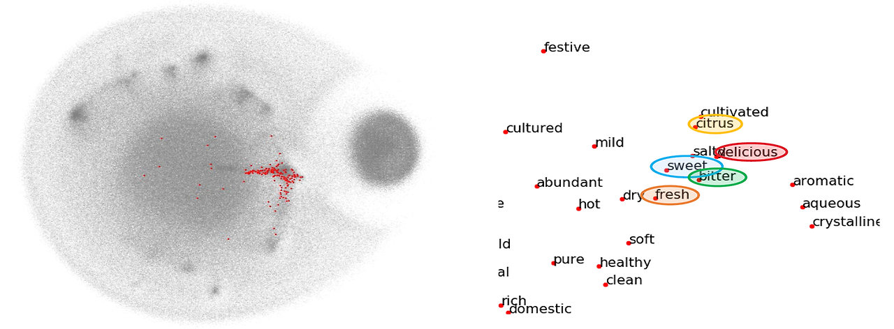 그림 4. (좌) 98만 위키 단어로 이루어진 벡터 공간. 붉은 점은 색채를 나타내는 감성어휘들이다 (우) 색이 아닌 의미적으로 유사한 어휘들이 모여 있음을 알 수 있다