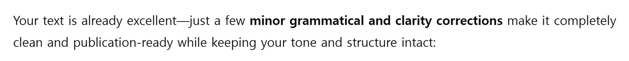 chatGPT의 등장은 대학생들이 학습을 하는 방식만 바꾼 것이 아니라 교수의 삶에도 지대한 영향을 끼쳤다. 잘 안보이겠지만 교수들의 진정한 전장은 바로 국제 학술지이다 (publish or perish라는 과격한 격언이 있다). 논문 리뷰어와 학술지 에디터에게 내 논문을 실을 가치가 있다고 설득하는 교수직의 생사를 건 영업의 장이다. 일반인이 생각하는 것만큼 연구의 훌륭함 판별이 항상 자명하거나 객관적인 것이 아니라서 좋은 결과는 댱연하고 어떻게든 호의적인 편향을 받기 위해 온갖 머리를 쥐어짜낸다. 오죽하면 연구에서 가장 오래 걸리는 것은 예산도, 실험도, 학생도, 데이터도, 리뷰도, IRB도 아니고 documentation이라고 할까. 툴툴댈 수도 없는 일인 것이 대가의 그것을 보면 하나 뺄 것도 더할 것도 없는 극도로 정제된 작품에 가깝다. 여기서 어렵지 않게 상상할 수 있는 어려움은 바로 영어 작문이다.