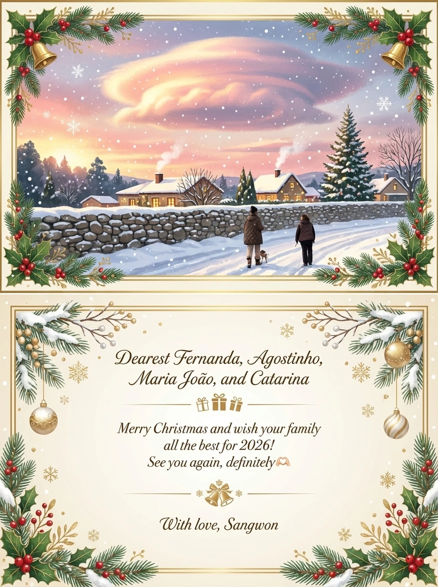보통은 어디에서 머물든 간에 머물고 나서 편지나 카드를 남기고 가는데, 이 날은 더 많이 걸어야 해서 일찍 출발하게 되면서 편지를 남기지 못한 게 마음에 걸렸다. 그래서 걷는 길에 AI로 어제 찍은 두 부부와 귀여운 강아지의 뒷모습을 넣은 연하장을 만들어서 내 마음을 전했다.