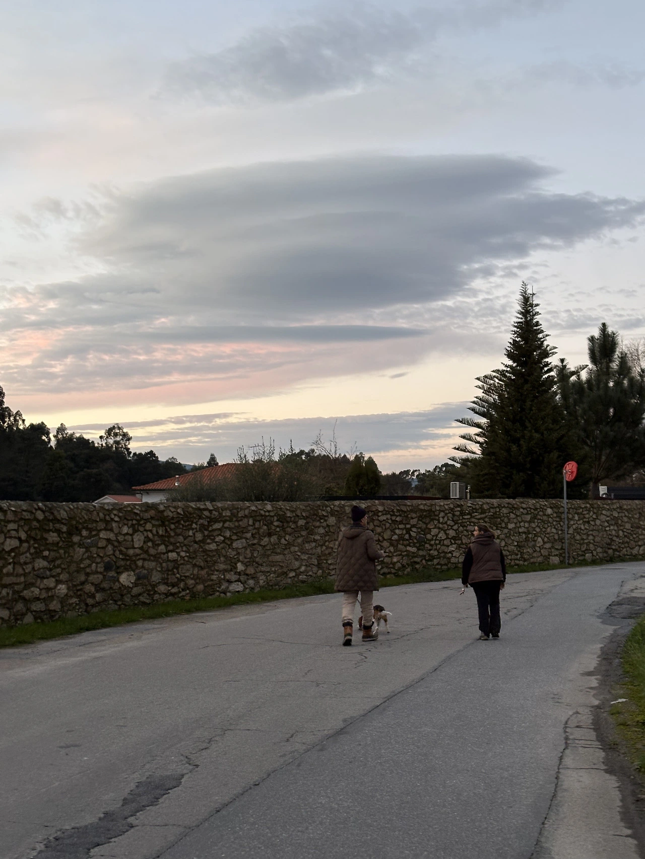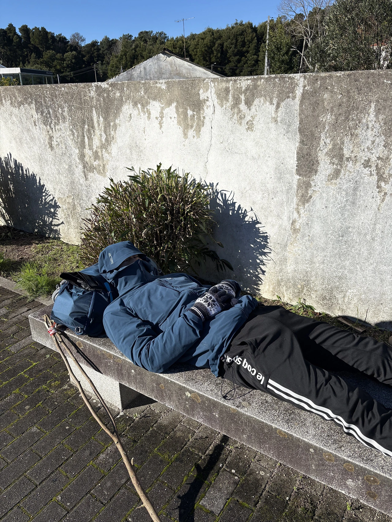 오전 내내 한참을 걷고 Cristelo라는 동네에 도달했을 때, 정말 햇살이 따스하게 내리쬐면서 낮잠을 자고 싶다는 생각이 들었다. 당시 4시간쯤 걷고 km수로는 약 14km 정도 걸은 때였다. 때마침 성인 남성 한 명 눕기 충분한 2m 정도 길이의 돌 벤치도 딱 두 개가 있길래 형한테 "우리 야외에서 낮잠 한 번 자고 갈래?" 물었더니 형이 너무 좋다고 하길래 잠깐 누워서 길바닥에서 자고 가기로 했다. 30분 정도 정말 누가 업어가도 모르게 깊은 단잠을 청하고 알람 소리에 눈을 떴다. 슬슬 신발의 매듭을 다시 조이고 천천히 다시 걸을 채비를 하고 형을 깨우러 갔다.