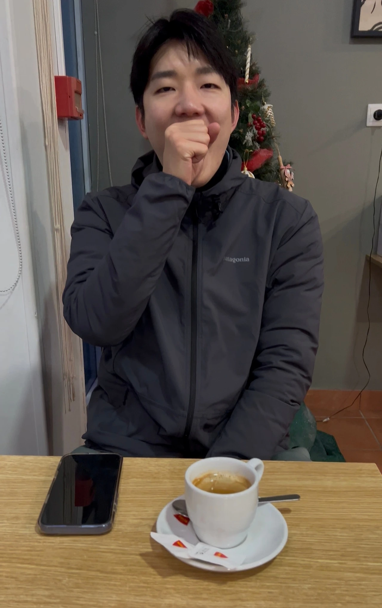 아무튼 이브에도 문을 열어준 감사한 카페 덕에, 맛있는 크루아상과 따뜻한 에스프레소를 마시며 추위에 잔뜩 언 몸을 녹일 수 있었다. 형이 카페에서도 영상을 자주 찍어줬는데, 아침에 찍어준 영상들을 보면 내가 매일 같은 옷을 입고 매일 하품을 하고 있다. 저 때까지만 해도 커피에 설탕을 따로 넣지 않고 쓴 맛 그대로 마셨는데, 어느 날부터는 나도 모르게 주는 설탕은 다 때려 넣고 마실 정도로 피로가 점점 누적되어 가는 것을 느꼈다.