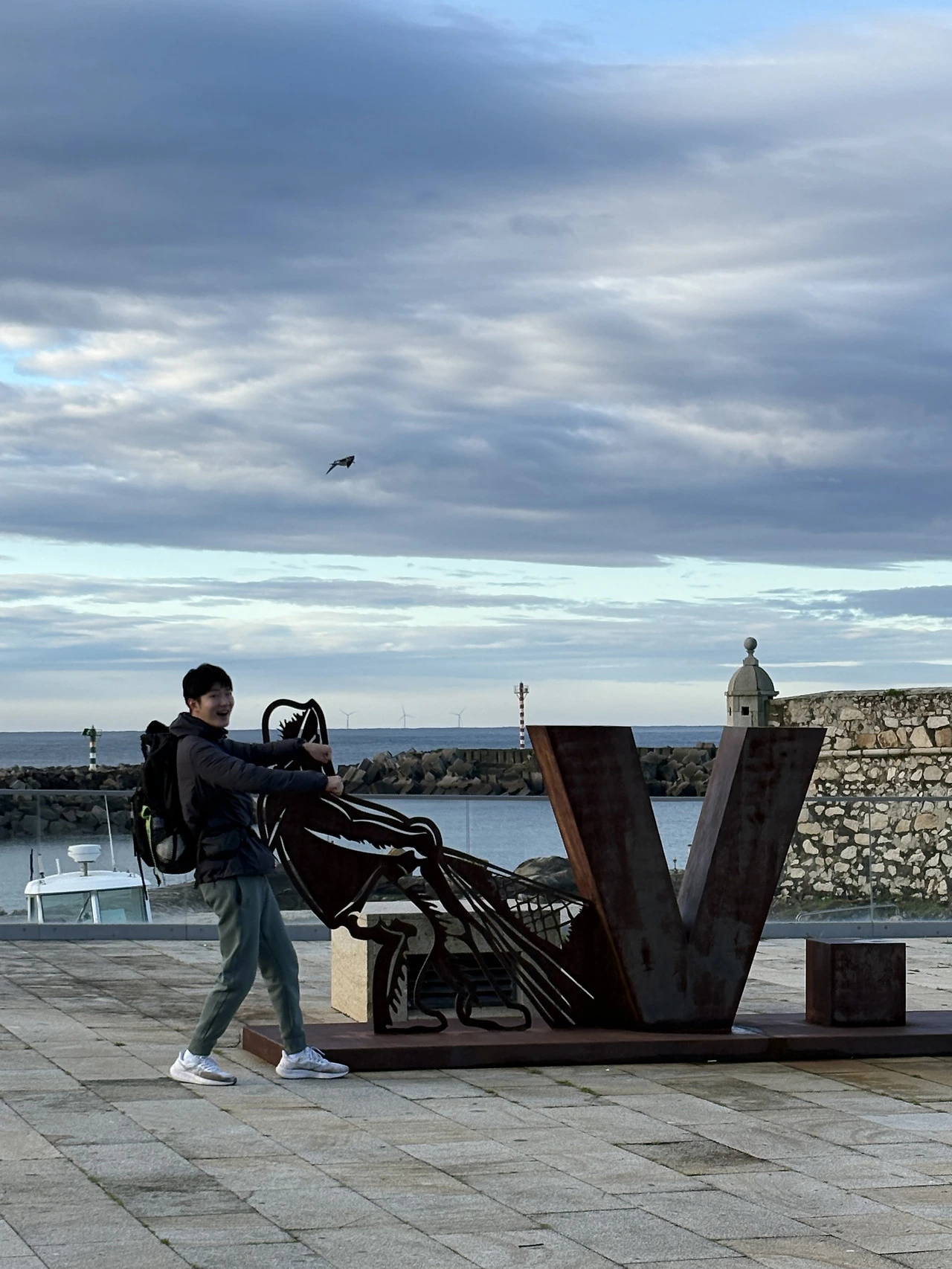커피와 빵으로 체력을 충전하고는 이내 다시 걷기 시작했다. Ancora 도심에서 얼마 안 가 Vila Praia de Ancora라는 부산 해운대 분위기의 해변가가 등장했다. 줄을 서서 나란히 걸어가는 염소 떼와 양 떼도 보고, 정말 아름다운 지평선과 낮게 깔린 구름도 보면서 황홀하다는 단어만 연신 내뱉으면서 걸었다. 이때쯤 10km를 돌파하고 기념 영상을 형과 함께 찍으면서 걸었는데 그 영상을 다시 틀어보니 바람 부는 소리에 대사가 씹힐 정도다. 내가 "날씨 너무 쨍하고 공기도 너무 좋은데, 약간 추운 것 같아. 머리가 아주 만신창이가 되었는데..." 했더니 형이 옆에서 "어차피 우리 안 씻었잖아. 괜찮아~"했다. 첫날 영상에선 어색해서 서로 파이팅만 외치던 사이였는데, 나중에는 걷는 내내 인생 이야기, 첫사랑 이야기 등 정말 오만 수다를 떨면서 걸었다. 걷는 내내 형한테 줄리아 로버츠나 클레어 폴라니 같이 활짝 웃는 사람이 이상형이라고만 열 번 가까이 얘기한 것 같다.