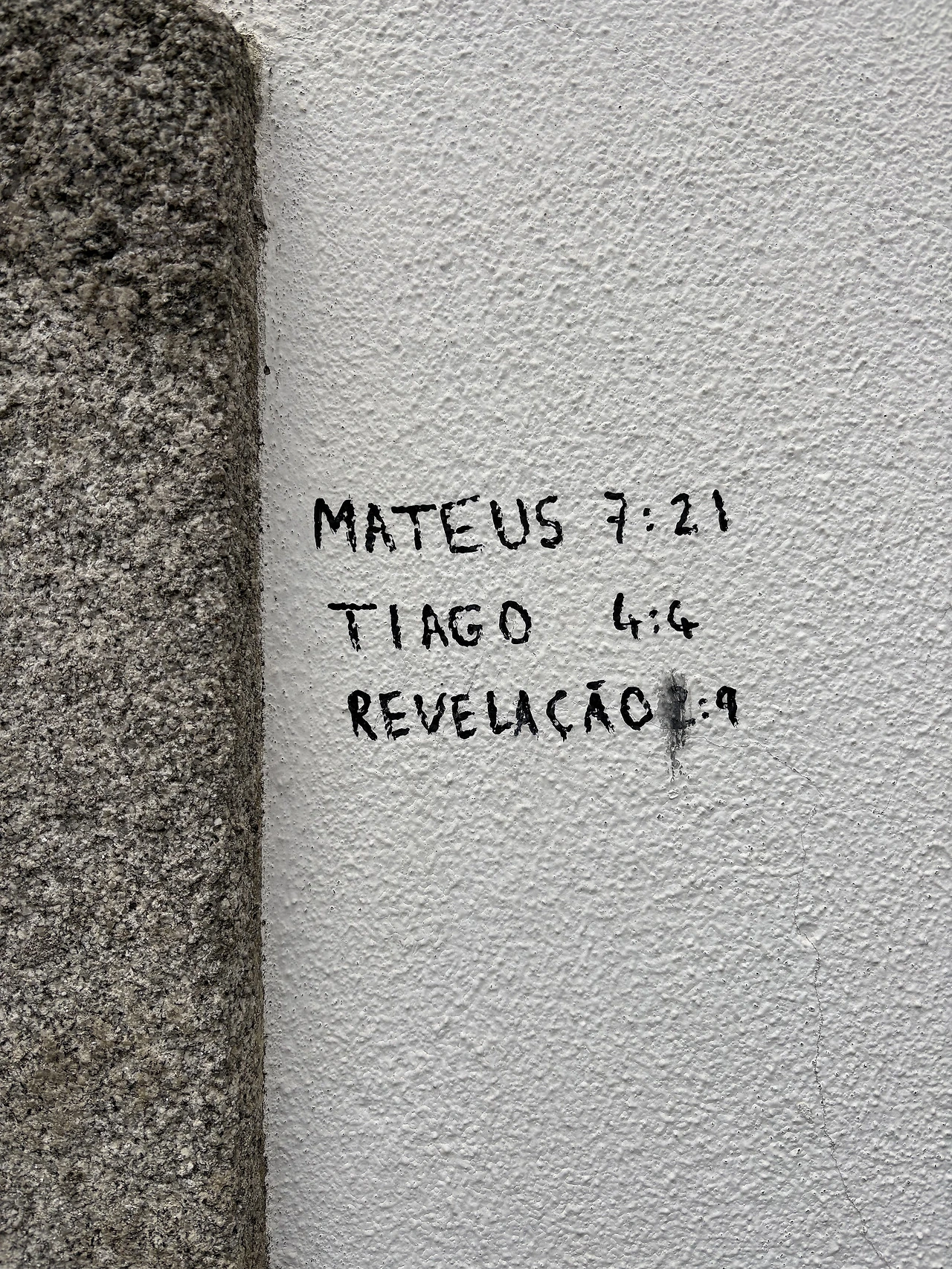 이곳에서 스탬프를 받으려고 했는데 점심시간인지 문이 굳게 닫혀 있었다. 그래서 빠른 포기를 하고 근처 식당에서 비를 피하며 점심을 먹기로 했다. 성당 앞을 지나는데 벽에 아주 작은 글씨로 "MATEUS 7:21" "TIAGO 4:4" "REVELACAO 2:9"라는 세 구절이 적혀 있었다. 이때를 시작으로 꾸준히 벽에 적힌 성경 구절이라거나 각종 메시지를 발견하곤 했는데, 순례자의 길이라서 그런지 정말 뼈를 맞는 듯한 느낌을 받는다거나 소름이 돋는다거나 하는 신비한 경험을 자주 했다. 저 세 구절 중에서는 마태복음 7장 21절의 말씀이 이 길을 시작하고 노력을 실천하는 우리에게 가장 와닿는 구절이 아닐까 싶었다.