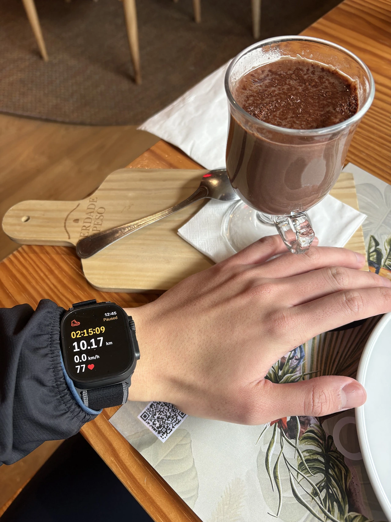 가장 가까이에 있는 Matosinhos 마을의 한 카페 겸 햄버거 매장에 들어갔다. 내부 인테리어가 모두 나무였는데 물에 젖은 생쥐같이 흠뻑 젖은 우리를 정말 한치의 망설임도 없이 들여보내준 이들에게 감사하다는 생각을 했다. 우리가 배정받았던 좌석이 어디인지는 그날 식당을 찾은 모두가 알 수 있을 정도로 우리의 물 발자국은 심각한 수준이었다. 먼저 주문한 발로나 핫초콜릿이 나왔는데, 정말 꾸덕꾸덕하고 마시면 피로가 풀리는 듯한 착각을 심어주는 당도의 음료였다. 이 날 인스타그램 스토리에 "핫초콜릿 세상에서 가장 맛있게 마시는 법: 두 시간 십오 분간 폭풍우 맞으며 떨면서 걷기!"라고 올렸을 정도로 맛있었다. 솔직히 버거는 그냥 그랬다.