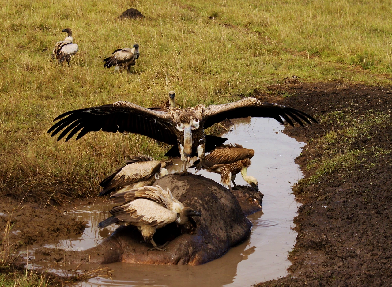다음 날 아침. 다시 찾은 마라 평원에서는 멀리에서도 어디에 그 하마가 있는지 알 수 있었다. 벌처들이 앞 다투어 날아 들고 있었기 때문이다.