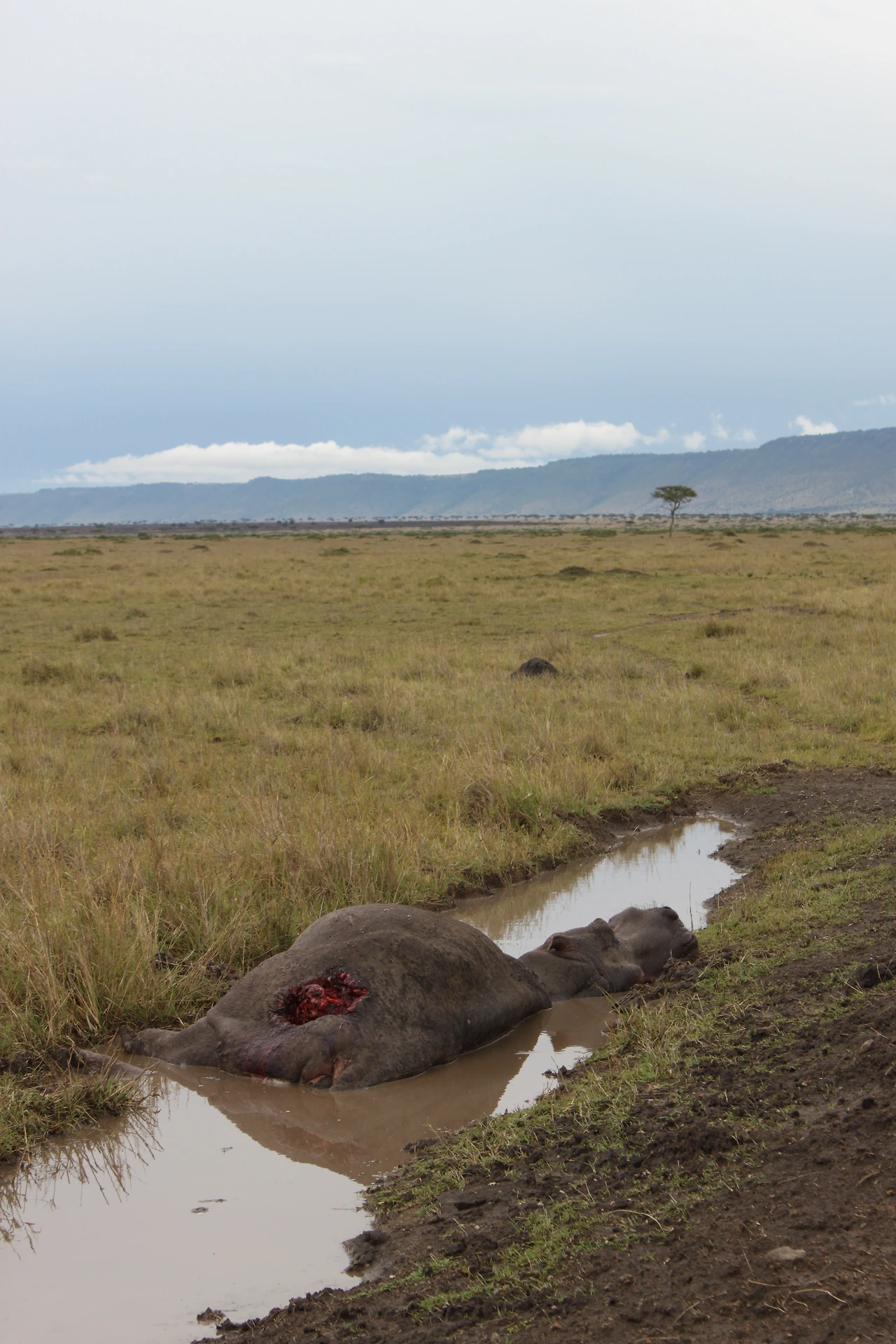마사이 마라 국립보호구에 들어 온지 삼일째 되는 날 오후. 게임 드라이브(크루저를 타고 야생동물을 찾아다니는 일)를 마치고 캠프로 돌아오는 길에 깊은 상처를 입고 쓰러져 있는 수컷 하마와 마추쳤다. 눈을 껌뻑이고 숨을 몰아 쉰다.