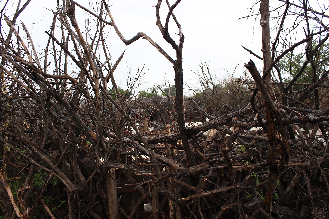 가시나무 울타리 안에 흙과 쇠똥, 나무로 지은 움막이 열 채 정도 되는 것 같았다.