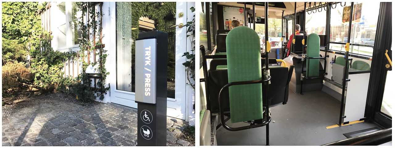 (우측 사진) 틸팅 (tilting) 기능이 기본으로 장착된 시내버스들. 휠체어나 유모차가 탑승 시 인도 쪽으로 버스가 기울어 수월한 승하차를 돕는다. 버스, 기차 안에도 이들을 세워 놓을 수 있는 공간이 마련되어 있다.