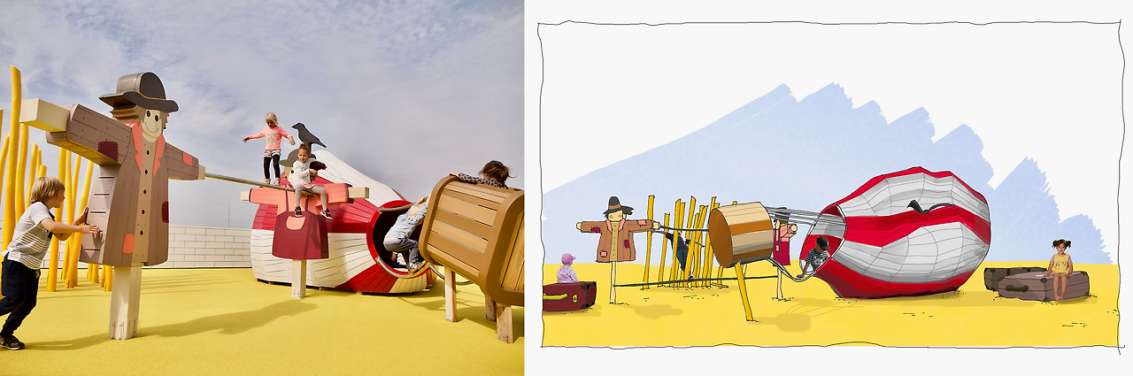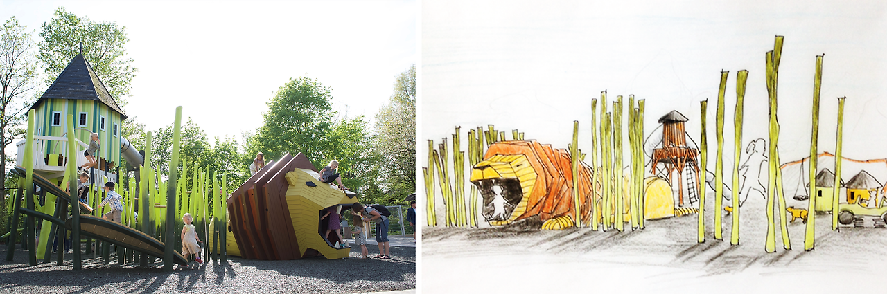 우리들이 잘 알고 있는 공간, 즉 아이들이 자유롭게 뛰어노는 ‘놀이터 (playground)라는 공간을 디자인하고 설계하는 일이다. 단순히 미끄럼틀이나 그네를 예쁘게 만드는 것이 아니라 그 놀이터 전체의 이야기 (story)를 구성하려 한다. 가령 성(castle)을 모티브로 한 미끄럼틀과 그 성을 향해 날아가는 독수리 형상의 구조물을 함께 구성하여 아이들로 하여금 다양한 상상력과 이야기를 만들어 낼 수 있도록 공간을 만드는 식이다. 바로 이러한 구성을 통해 아이들은 그들만의 창의력과 이야기를 만들어 내는 곳으로 재창조하게 되는 것이다.