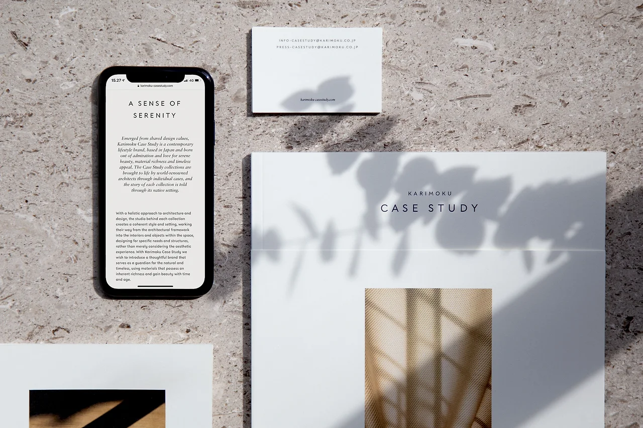 일본 목재가구 브랜드 KARIMOKU와 협업한 브랜딩 작업. 브로셔부터 어플리케이션까지 통합 솔루션 제공 ©Kontrapunkt