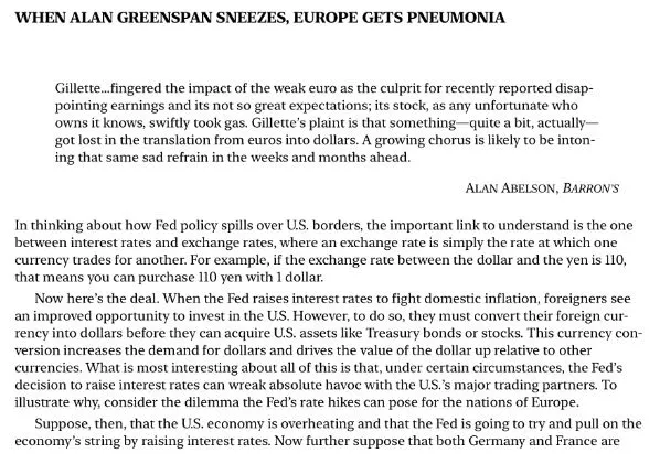 오늘날의 글로벌 경제를 이해하려면 이러한 상호작용의 본질을 파악해야 하는데, 특히, 책에서 언급한 미국의 금리 인상이 유럽 경제에 강요하는 두 가지 선택이 있다고 한다. 환율 하락 방치 혹은 금리를 따라 올리기. 이는 글로벌 경제의 취약성을 적나라하게 보여준다.