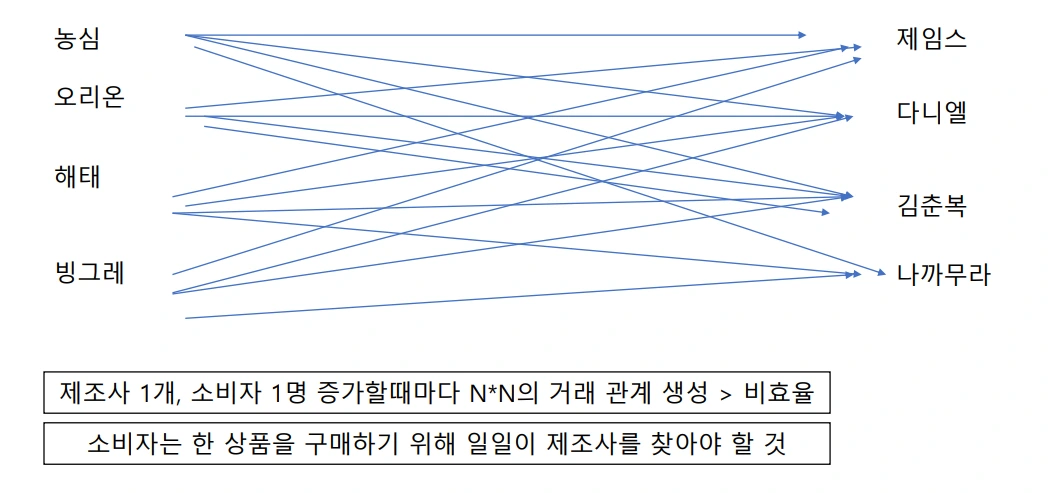4개의 과자 공급사가 4명의 사람에게 과자를 파는 구조를 그림으로 나타낸 것이다. 총 4*4 = 16개의 거래 관계가 나타난다. 이 의미는 제임스가 농심/오리온/해태/빙그레가 만드는 과자 하나를 사기 위해 4개의 제조사에 직접 찾아가야하거나 구매를 진행해야하고, 각 제조사는 과자 한 봉지씩을 팔기 위해 세상의 많은 제임스들과 연락을 취해야 한다. 지금은 단순히 4개씩 표현했지만 공급사가 10개가 되고, 소비자가 만명인 시장이라면 10*10,000 = 100,000으로 총 10만개의 관계가 생기게 된다.