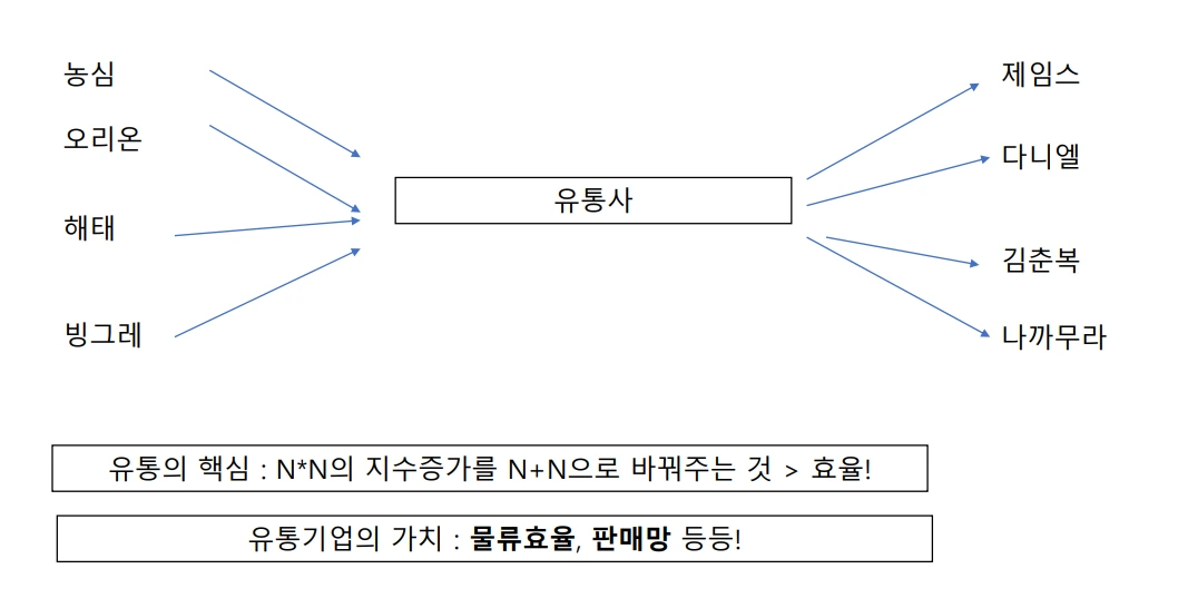 여기에 만약 유통사가 가운데 있다면 어떻게 될까? 각 제조사들은 유통사에게 물건을 가져다주고 , 각 소비자들은 유통사에게 물건을 구매한다. 단계가 하나 추가됨으로써 많은 거래 관계가 소멸되는 것을 볼 수 있다. 총 거래 발생 수는 4+4 = 8로 줄었고, 10개의 공급사와 10,000명인 시장이 있다면, 거래 관계는 10 + 10,000 = 10,010으로 공급사가 늘고 소비자가 늘어도 거래 관계가 그다지 복잡해 지지 않음을 알 수 있다. 유통사는 거래 중간 단계에 참여해 공급자와 소비자를 간접적으로 연결함으로써 직접적으로 연결했을 때의 불편함을 해소하는데 경쟁력이 있다. 복잡한 현대 소비 구조에서 유통사는 꼭 필요한 존재이다.