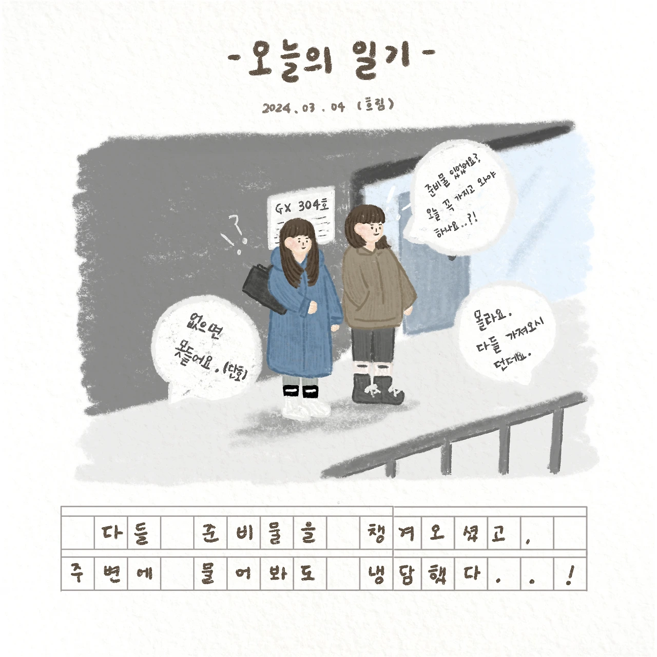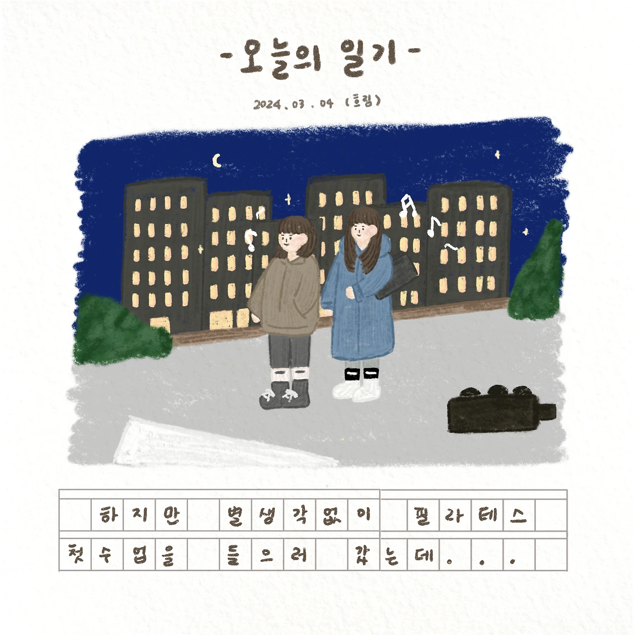 그래서 더욱 방어적인 분위기 속에서 버티기 싫기도 하고 또 눈길이 집중이 되는 것이 싫어서 엄마와 3월 첫 수업에는 참여하지 않았다.