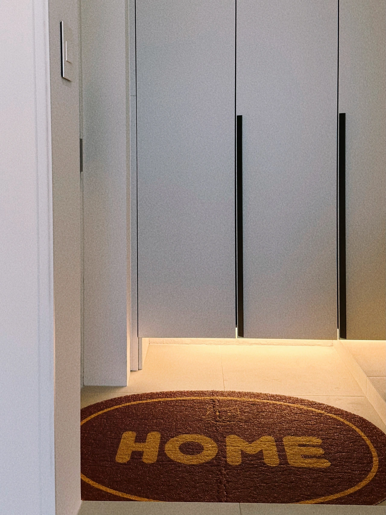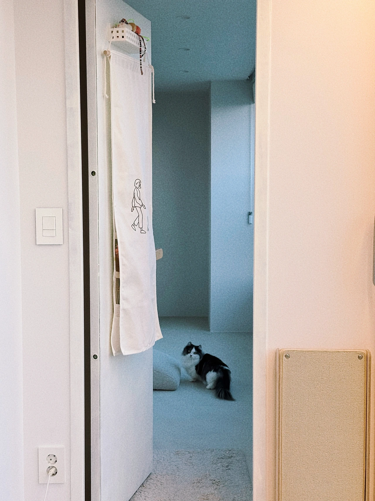 고급 페인트칠을 한 방화문은 고양이 낚시대 보관함으로, 심혈을 기울여 골랐던 현관 타일은 커다란 매트로 잘 가려두고 있다.