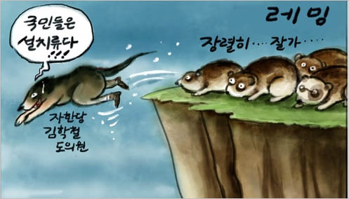 2017년 자한당의 김학철 도의원이 국민을 '레밍'에 비유해 논란의 중심에 선 적이 있었다. 당시 최악의 물난리를 겪고 있던 충청북도 도의원이던 그는 마침 그 때 일행과 함께 외유성 유럽 유행 중이었는데, 즉시 귀국하라는 국민적 원성을 '설치류인 레밍'에 비유하며, 국민의 집단행동을 비난하는 막말로 나락에 빠진 적이 있었다. 평상시의 국회의원, 도의원 들의 외유성 해외여행에는 침묵하다가, 사회적 이슈가 발생될 때마다 집단적으로 목소리를 내는 것도 문제가 되지만, 사회적 개념과 정무적 감각이 없는 '김학철 도의원'이 더 크게 부각되었다.