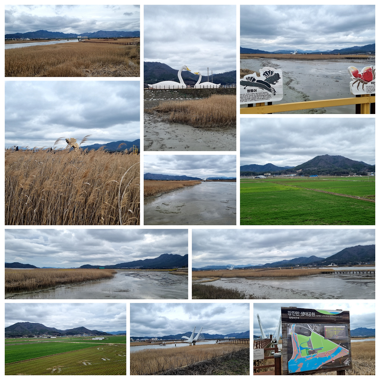 청자축제 장에서 몇 시간 보낸 다음에 찾은 곳은 근처에 있는 생태공원이다. 아직 때가 되지 않아 울창한 갈대밭의 멋진 풍경을 볼 수 없었지만, 넓은 생태공원내를 산책하면서 많은 상념을 정리할 수 있었다. 그 넓은 지역에 조성된 갯벌과 갈대밭은 망둥어, 가게, 갯지렁이, 천퉁오리 등 다양한 생물들을 품고 있었다. 갈대가 한창인 가을에 오면 최고의 포토존을 보여줄 것으로 확신한다. 생태공원 주변으로는 보리밭으로 푸른 장관을 보여주고 있었다. 한 폭의 그림이다.