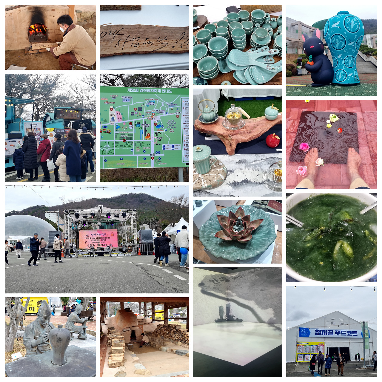 식사를 하고 나오니, 따뜻한 물 속에 족욕을 하고 있는 사람들이 눈에 띄였다. 줄곳 걸어다니느라 피곤한 발을 생각해 일초의 망설임없이 양발을 벗고 들어갔다. 그런데 다들 어디서 났는지 수건을 다 들고 있었다. 입장료가 있었던 것을 몰랐다. 천원의 입장료로 수건을 얻을 수 있었다. 피곤한 발도 풀고 난 후, 본격적으로 청자 투어를 시작했다. 다양한 청자 전시와 체험이 준비되어 있었고, 청자로 만든 도자기들을 할인된 가격으로 판매하는 곳도 많았다. 몇개의 소소한 물건들을 샀는데, 그 중엔 청자로 만든 주걱도 있고, 일명 원샷잔이라 불리는 밑부분에 구멍이 뚫린 소주잔도 있다.