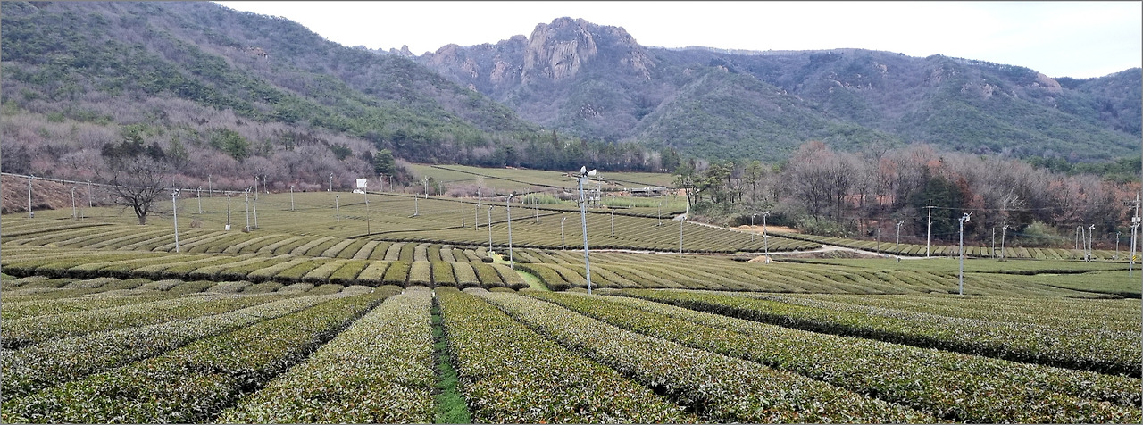 울퉁불퉁한 강인함의 월출산을 배경으로 안정적이고 넓은 초록의 녹차밭이 고요하게 자리하고 있으니 이 자체로 평화스럽다 말할 수 있다.