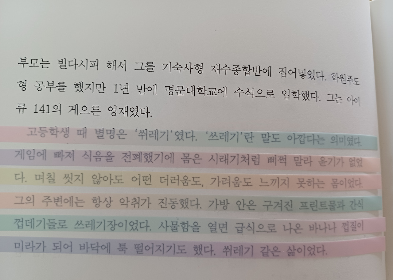 우리의 주인공은 관심에도 없던 여자와 하룻밤을 보내고 아버지가 된다. '그는 그날 생명이 잉태될 정도로 진심을 담은 적이 없었다.' 이 문장을 읽는 순간 나는 진심을 담아 "이 쒸레기 같은 놈!"이라고 욕을 내뱉었다. 여자는 정우에게 아기를 보내고 사라진다. 그는 대학 새내기면서 비혼부가 된다.