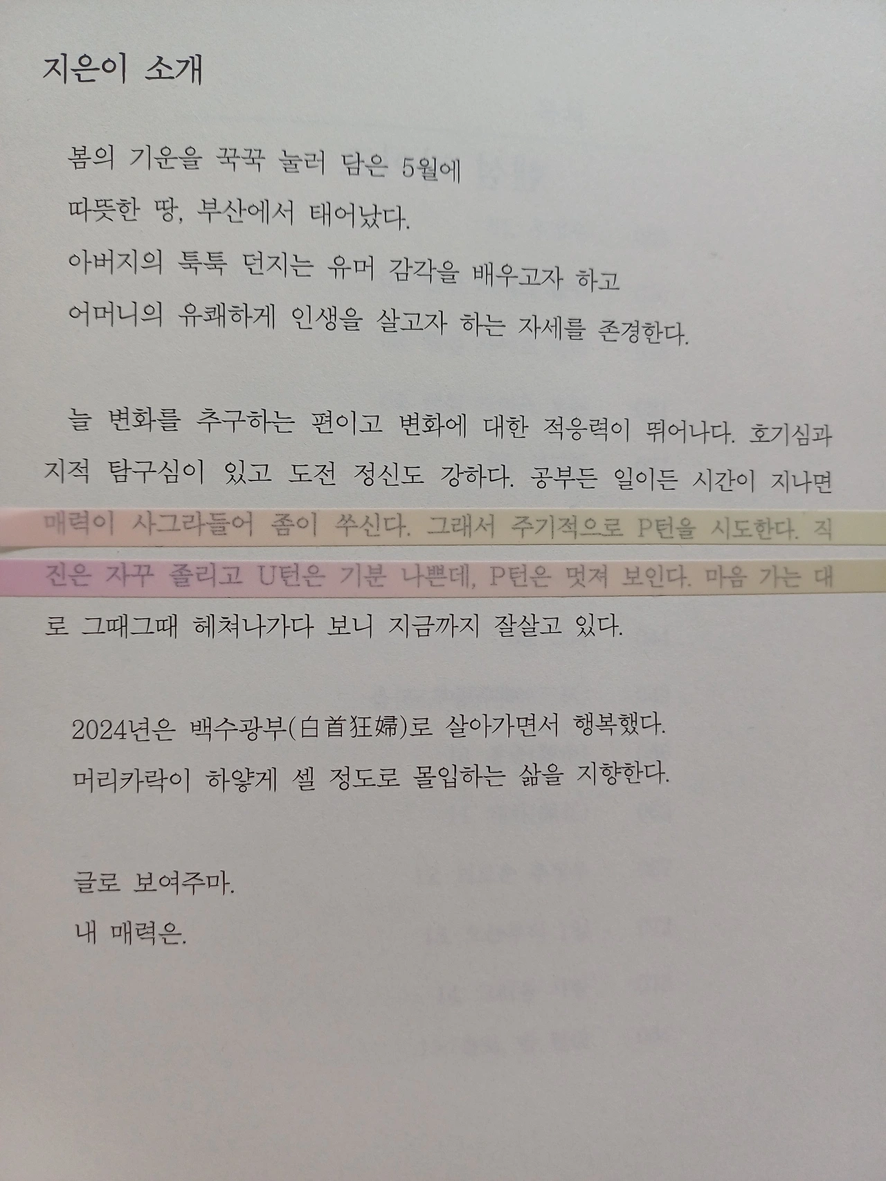 그녀는 멋져 보인단 이유로 삶에서 주기적으로 P턴을 시도한다. 매력은 글로 보여주겠다는 당찬 포부, 멋진 작가다.