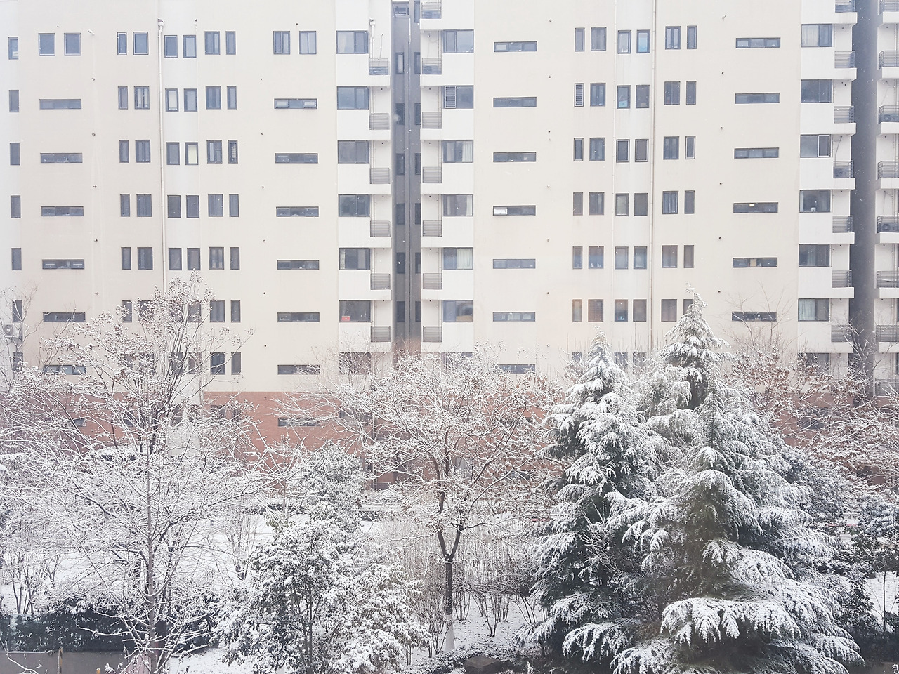 눈발이 휘날리는 하늘을 날아 도착한 신혼집.
