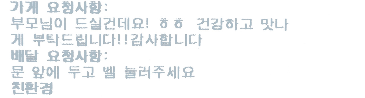 식탁을 정리하고 삼계탕을 담아 온 봉투를 분리수거 박스에 넣기 위해 발걸음을 옮겼다. 봉투에 흰 종이가 매달린 게 보였다. 영수증이다. 무심코 종이를 떼 버리려다 삼계탕 가격이 궁금해 보니 뭔가 다른 게 있다. '부모님이 드실 건데요! ㅎㅎ 건강하고 맛나게 부탁드립니다!! 감사합니다'란 문구다. 순간 맘이 찡하다. 울 딸이 가게 사장님께 한 요청사항이 영수증에 인쇄되어 있었다. 능이버섯 삼계탕에 이어 연타로 감동이다. 맛있음을 더해 건강해진 기분이다.