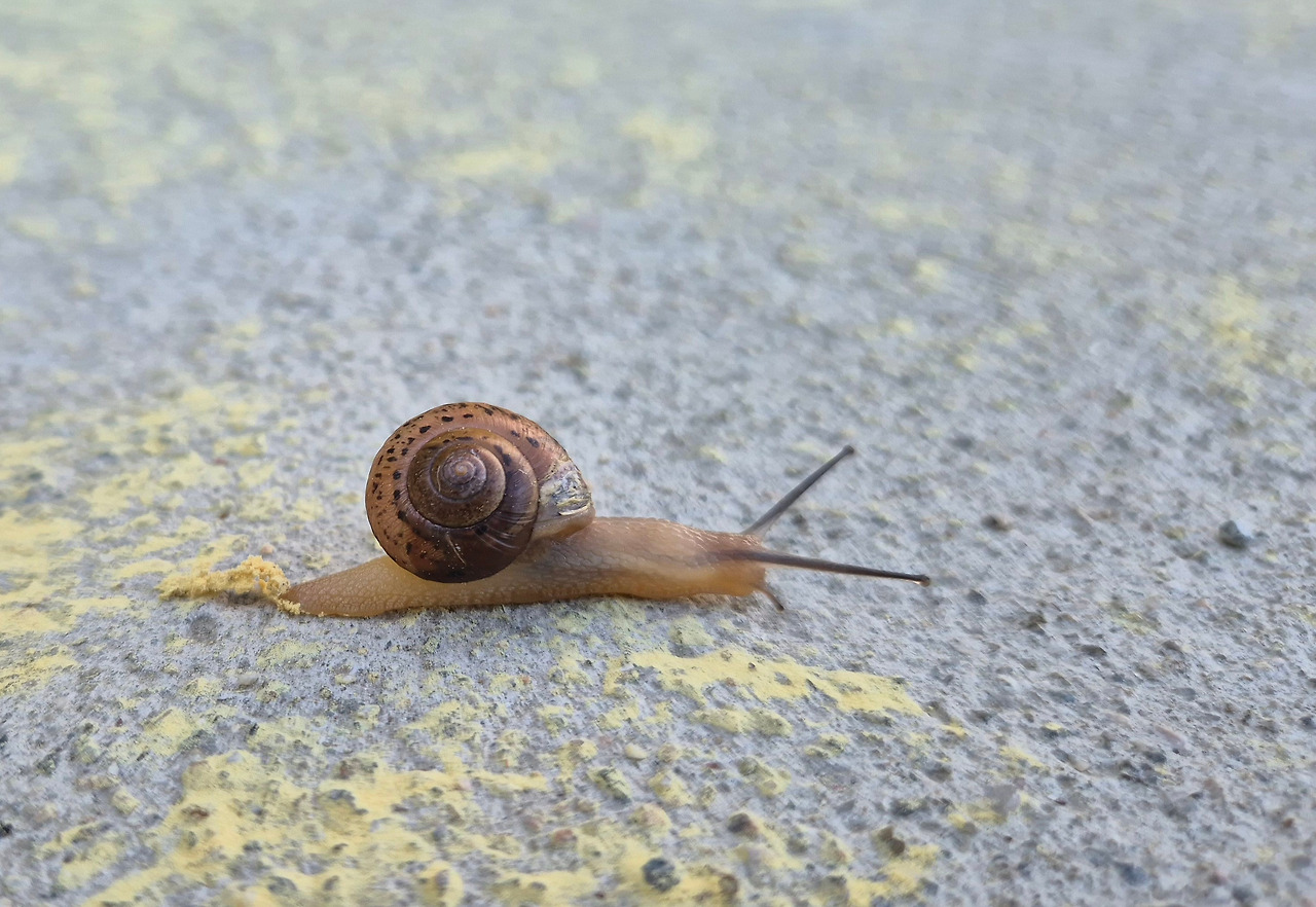 무심히 앞만 보고 걷다 바닥의 뭔가에 시선이 닿는다. 달팽이다. 이 길은 몇 년 전 콘크리트로 포장한 산책로다. 사람이 다니는 길에 올라탔으니 긴 두 눈이 좌우로 바쁘다. 익숙한 풀숲 풍경이 보이지 않는다. 달팽이는 경로를 이탈했다.