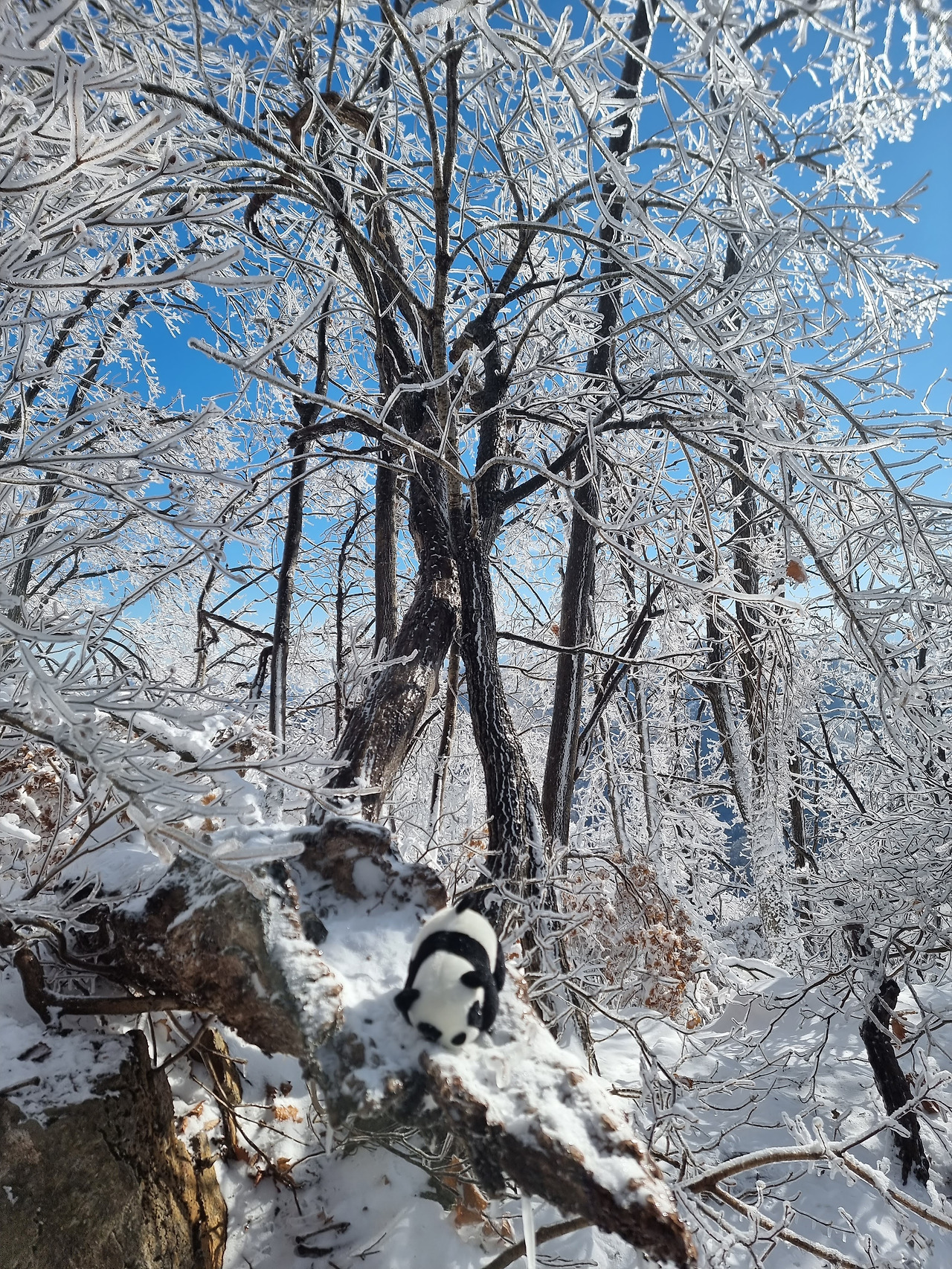 판다와 함께 고드름이 가득한 계방산의 정상석에서 사진을 찍었다. 사진을 보니 내 모자 위에도 하얗게 눈과 얼음들이 달라붙어 판다의 하얀 머리와 닮아있었다. 판다는 크게 입을 벌리고는 깔깔대어 주었다. 바람을 피해 살짝 아래로 내려와 잠깐 쉬고는 왔던 길로 하산을 시작했다. 하산을 하며 판다는 끊임없이 조잘대었고 하산길은 지루하지 않았다.