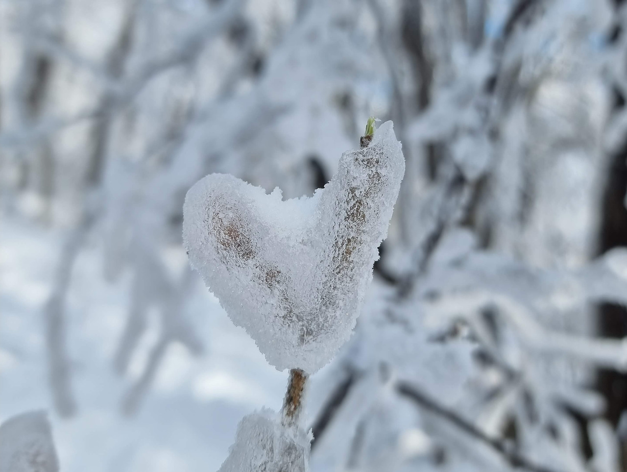 그렇게 한참을 걷다 잠깐 쉬어갔다. 물을 마시려고 챙겨간 페트병을 꺼내서 물병을 돌리는데 물병의 입구가 꽁꽁 얼어붙어 있었다. 물병을 이리저리 흔들어 겨우 작은 틈을 만들고 나서야 슬러시 같은 물을 조금 마실 수 있었다. 그때 멀리서 판다가 재미있는 걸 발견했다면서 오라고 한다. 그러면서 하트모양으로 얼어붙은 나뭇가지를 손에 들고 흔들어주었다. 그 모습이 너무 사랑스러워 나도 한껏 판다를 안아주었다.