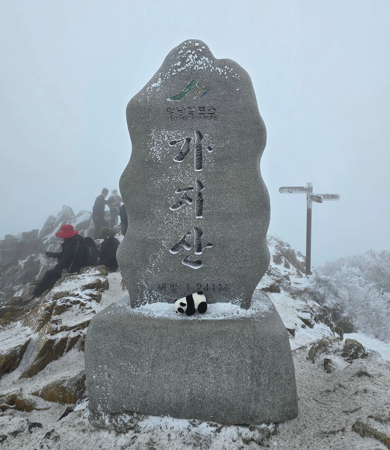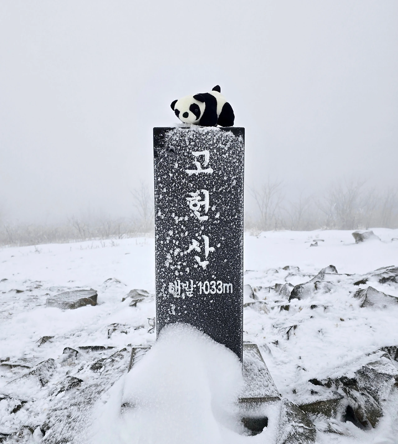 한참을 눈을 밟으며 올라가서 정상에 도착할 수 있었다. 정상에는 시내가 탁 트이는 조망권이 있었지만 심한 안개는 주변의 시야를 차단했고 기대했던 멋진 광경은 볼 수 없었다. 하지만 안개가 가져다준 고요함은 충분히 좋은 기억을 주었다. 고헌산 정상석에서 판다와 사진을 함께 짧은 고헌산의 산행을 마무리했다.
