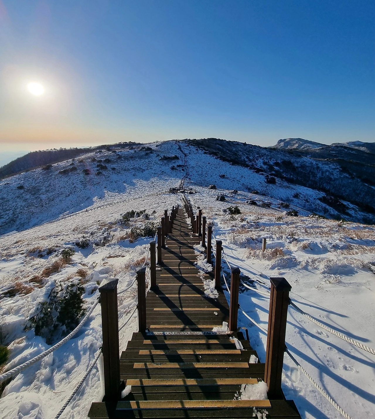 해가 떠오르니 추위는 한결 나아지고 주변의 풍경이 눈에 들어오기 시작했다. 영축산에서 신불산으로 가는 길은 긴 능선이 이어진다. 이제야 영남알프스라 불리는 이유를 알 것 같았다. 능선을 걷는 경험은 기분을 정말 좋게 했다. 남쪽의 영축산에서 북쪽으로 이어진 길을 걸으면 오른쪽의 해와 왼쪽의 달이 함께 길을 걷게 된다. 만날 수 없던 두 인연이 내가 매개체가 되어 함께 걸으며 새로운 이야기를 써 내려갈 것 같은 감상에 젖어들게 된다. 날씨도 좋아서 구름 한 점 없이 파란 하늘에 해와 달과 한참을 기분 좋게 걸어본다. 불과 한 시간 전에 어둠을 헤치며 눈 속에서 길을 찾아 헤맷었다는게 믿기지가 않는다. 오르막이 없이 평지처럼 길게 뻗은 능선길에 시야는 탁 트였고 오른쪽의 햇살이 따갑게 비추고 있어서 온몸의 냉기는 사라진 지 오래다. 이게 바로 힐링산행이다. 가을에 많은 사람들에게 추억을 안겨주었을 억새들은 눈아래 묻혀있었지만 얼마나 멋진 장관을 보여주었을지 상상이 된다. 그러면서 가을에 다시 와서 이 광경을 꼭 봐야겠다고 마음에 새기며 걸음을 이어간다. 등산로 옆으로 바람을 잠시 피하고 앉기 좋은 나지막한 돌들이 모여 있는 곳이 보인다. 등산로를 잠시 벗어나서 무거웠던 배낭을 잠시 내려놓았다. 겨울의 추위에 단단히 조여왔던 것들을 하나둘씩 벗어내니 몸도 가벼워졌다. 그리고 잠시 쉬어 아침식사를 한다.
