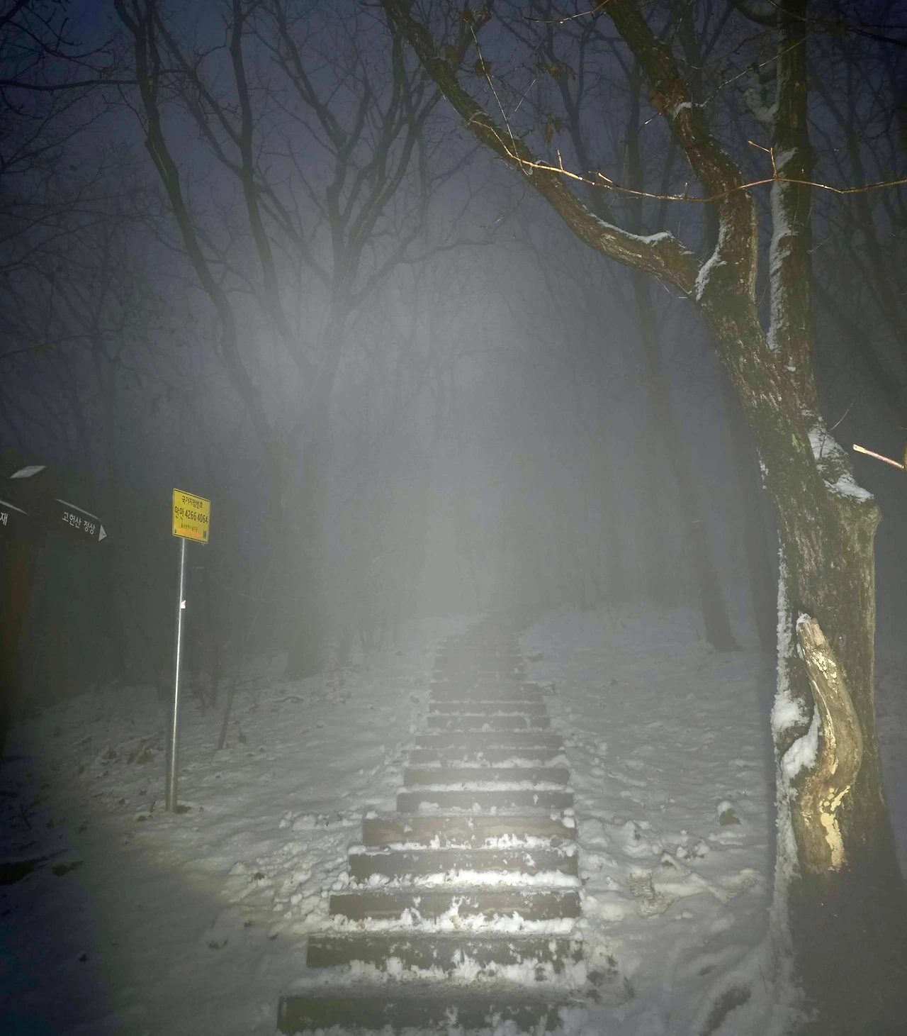 800미터쯤 올라오니 등산로는 눈길로 변하게 된다. 눈이 쌓이면 등산로는 구분이 잘 되지 않아서 누군가의 발자국에 의지해서 길을 찾아야 하는데, 새벽엔 불빛이 멀리 닿지 않아서 바로 앞의 발자국만으로 길을 찾아야 한다. 발자국을 따라갔다가 잘못된 길임을 직감하고 되돌아오기를 두어 번 하고 나면 '여기 아님'이라고 표시를 해주고 싶을 때가 있다. 누군가도 내 발자국을 따라서 잘못 들어올 수 있겠지 싶다. 국립공원이 아니면 이렇게 길 찾느라 시간을 허비할 때가 있다.