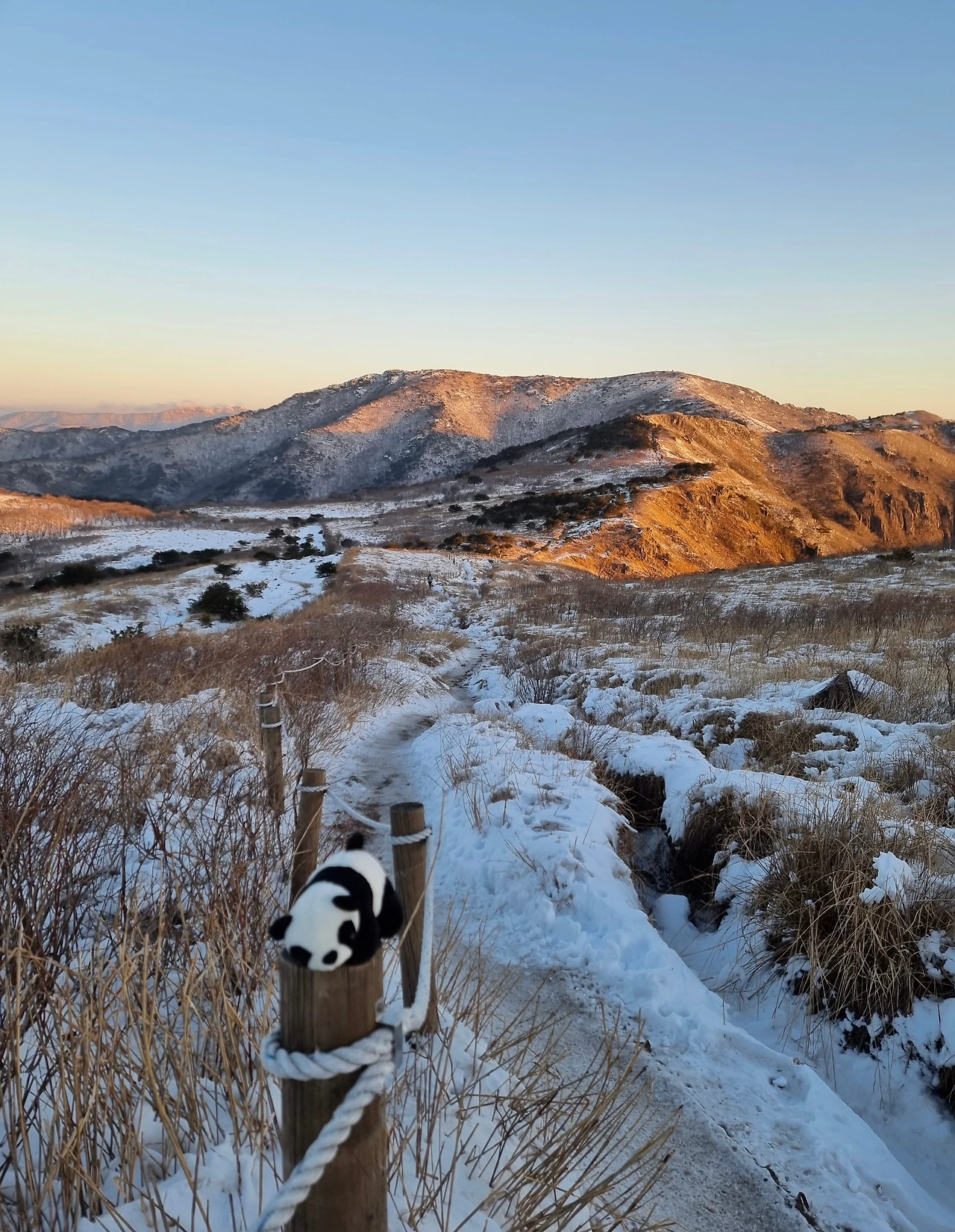 가지산으로 향하는 길은 운문산과는 너무 다른 풍경을 보여주었다. 안개는 똑같았지만 이곳은 불과 한 시간 전에 운문산에서 보지 못한 상고대가 아름답게 피어 있었고, 등산로는 눈에 쌓여있어서 마치 다른 세상 같았다. 아까의 흙길과는 다르게 판다도 내려서 함께 눈을 밟으며 길을 걷기 시작했다. 겨울을 버틴 솔잎에는 안개가 얼어붙어서 상고대가 탕후루처럼 맛있게 얼어있었다. 길 한편에는 누군가 만들어 놓은 예쁜 눈사람이 있었고 판다는 신나서 눈사람 옆에서 뛰어놀았다. 안개가 가득해서 등산 중에는 풍경을 보지는 못했고 눈길과 상고대가 반복되는 길을 무작정 걸어갔다.