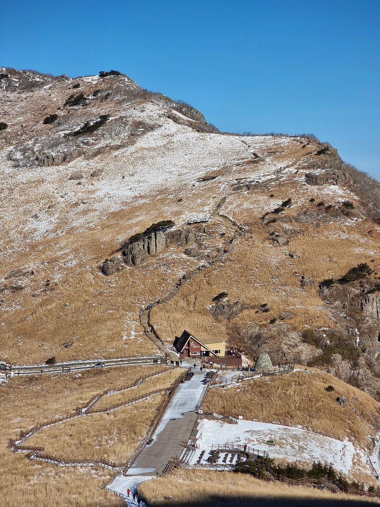 신불산에서 간월재로 향하는 길은 제법 가파른 길이었다. 북쪽이 비탈길이라 눈이 녹았다가 얼어붙어서 빙판길로 변해 있어 상당히 위험했다. 그리고 많은 사람들이 찾아서 그런지 길도 많이 훼손되어서 걷기 편한 길은 아니었다. 반대로 올라왔으면 꽤나 힘들었겠다 싶었다. 엉금엉금 기다시피 하산을 계속하다 보니 저 멀리 유럽에서나 볼법한 삼각형 지붕을 가진 간월재휴게소가 보였다. 가을이 되면 많은 사람들이 억새를 즐기기 위해 찾는 것으로 유명한 곳이다. 간월재 부근은 많은 사람들이 휴식을 할 수 있도록 테이블과 의자가 많이 있었다. 휴게소는 10시에 오픈한다는 안내가 붙어 있었고 내가 도착한 시간은 이보다 빠른 시간이라 휴게소 안에서 휴식을 하지는 못했고 잠시 둘러본 후 마지막 목적지인 간월산으로 향했다. 이미 많이 걸어온 탓에 눈앞에 보이는 언덕을 다시 올라가야 한다는 게 쉽지 않았지만 걷다 보면 언젠가는 정상에 도착한다는 등산의 명언을 믿으며 터벅터벅 계단길을 올라갔다. 그래도 주변의 풍경이 좋아서 지루하지 않게 걸을 수 있었다. 그렇게 풍경을 보며 걷다 보니 간월산 정상에 오를 수 있었고, 좁은 정상석 위에서 기념사진을 찍고 바로 하산을 했다. 다시 만난 간월재휴게소에서 아까 먹다 남긴 성심당의 잠봉뵈르를 마저 먹으며 잠시 휴식을 했다. 하산길은 굽이굽이 돌아가는 긴 도로를 따라가야 했다. 새벽부터 시작한 등산이라 지친 우리는 서울로 돌아오는 버스 안에서 편하게 쉬며 돌아올 수 있었다. 그다음 주의 험난한 영남알프스의 미래는 예상하지 못하며...