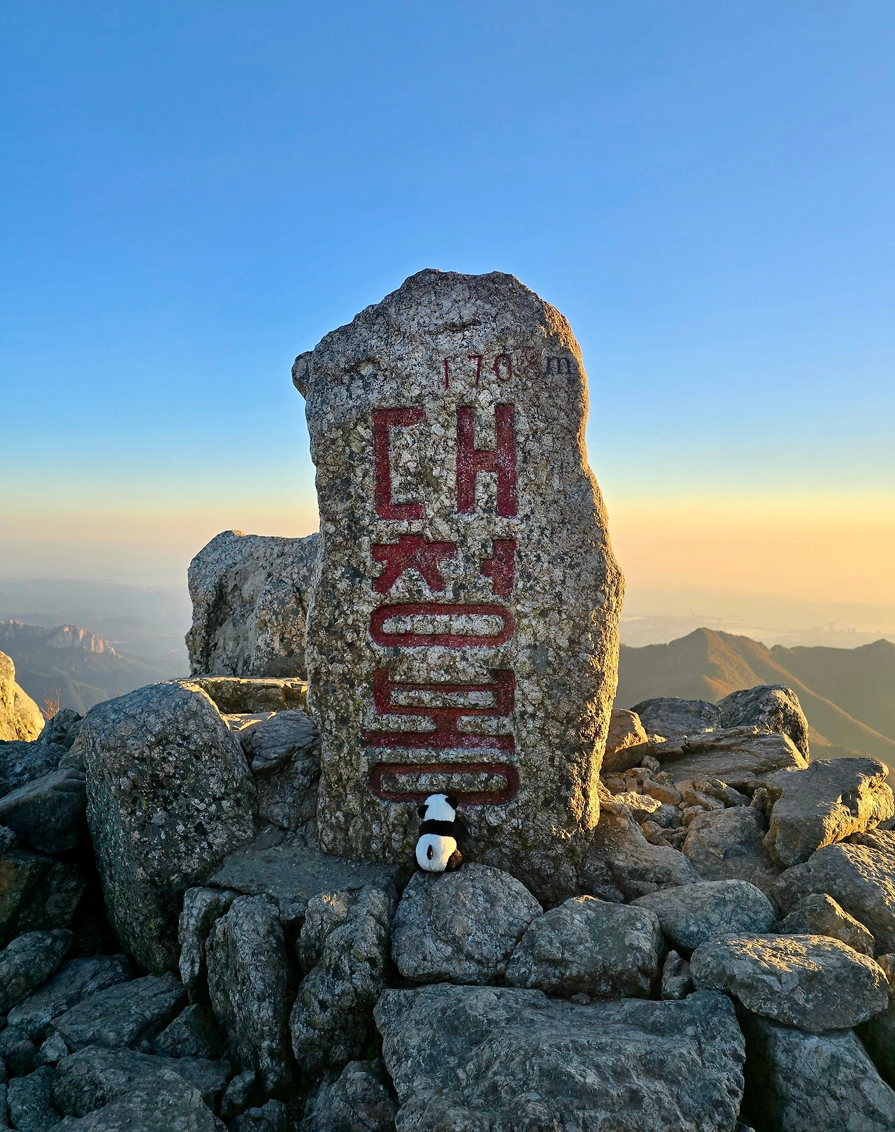 그렇게 한참을 태양이 떠오르는 것을 보고 난 후 대청봉의 정상석에서 판다와 사진을 찍었다. 정상석에는 붉은 글씨로 대청봉이라고 쓰여있었고 1708m라고 적혀있었다. 정상석은 푸른 하늘을 뚫고 올라오듯 서있었고 큰 무게를 자랑하듯 바닥에 단단히 고정되어 있었다. 그리고 뒤로는 동해바다가 보였고 비스듬히 붉은 햇빛을 받아서 오돌토돌 돌의 질감을 자랑하듯 보여주었다. 우리나라에서 세 번째로 높은 곳에 서게 되었고 판다는 정상석으로 얼른 달려가 자기보다 더 큰 바위를 크게 안아주었다.
