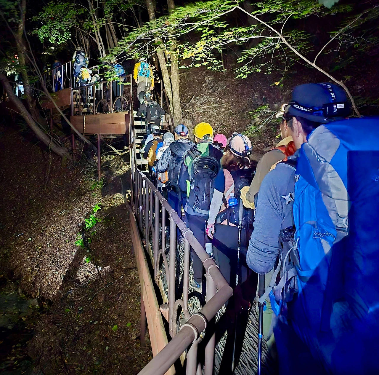 새벽 3시가 되자 남설악탐장지원센터로 가을의 설악산과 대청봉의 일출을 보기 위한 등산객들이 우르르 몰리기 시작했다. 흔히 말하는 등산열차가 떠오르는 순간이다. 머리에 헤드렌턴을 두른 사람들이 한 줄로 기차가 되어 앞사람의 등만 바라보며 천천히 이동을 하고 있었다. 전국의 등산객들이 이곳에 다 모인 것처럼 잠깐의 추월도 허용하지 않을 만큼 빼곡히 줄을 서서 천천히 천천히 이동을 하게 되었다. 멀리서 본다면 불빛을 내는 하나의 큰 생물처럼 보였을 것 같았다. 여기서는 길을 잃을 염려도, 무리해서 오르다 탈진한 염려도 없을 것 같았다. 잠시 시간을 되돌려 화장실 간다고 늑장 부려서 5분 늦게 입장한 게 후회가 되었다. 이 많은 사람들이 모두 같은 곳을 향해 가면 정상엔 사람이 가득할 것이 예상이 되었으니까..