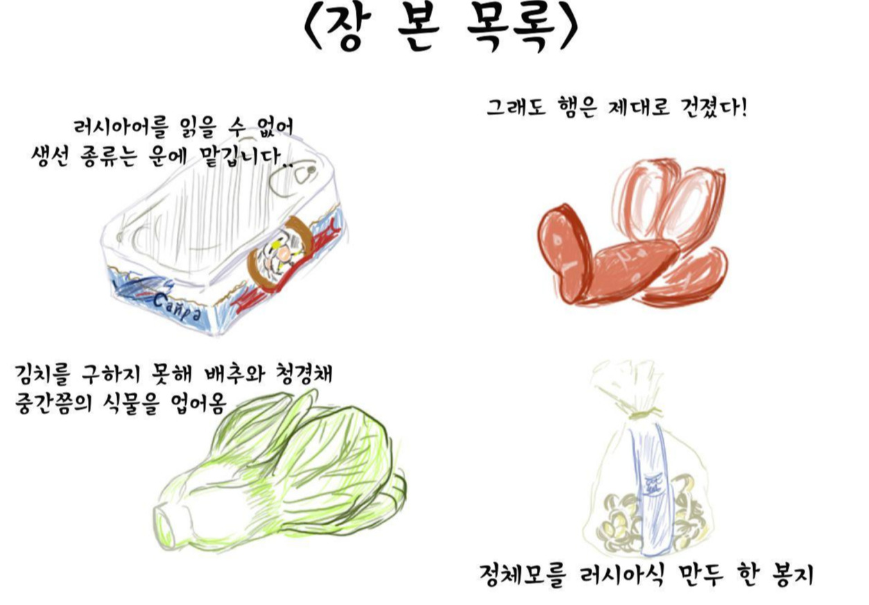 저희가 묵었던 게스트 하우스는 벽면에 6칸짜리 캡슐이 붙어있는 캡슐호텔 비슷했고, 안쪽에 들어가면 한 사람이 자기에 딱 맞는 아늑한 공간이었습니다. 부엌이 공용이었고, 냉장고엔 각자의 이름을 적어서 비닐봉지에 넣어두고 먹었습니다. 러시아에서의 물가는 게스트 하우스가 처음이었던 우리도 그곳에 녹아들게끔 해 주었습니다. 점심에 길에서 돌아다니다 아르바트 거리나 그리스도 대성당 근처에서 괜찮아 보이는 식당을 들어가면 인당 2~3만 원이 나왔는데, 저녁거리를 살 겸 장을 보러 마트를 가면 3~5만 원 이서 남자 다섯이 저녁은 물론 야식과 다음날 아침까지 거뜬했습니다. 그래서 저흰 매 저녁마다 마트에서 장을 보곤 했었죠.