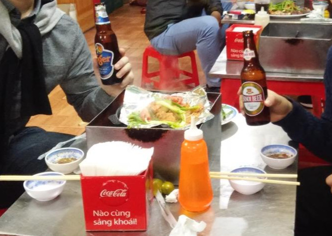 불판이 있는 테이블은 한국에만 있는 고유한 문화인 줄 알았는데 신기하게도 이곳에서도 테이블 가운데에 불판이 있습니다. 고체연료에 불을 붙이고 은박지를 깔아 세팅을 마무리하자 가지, 오이 그리고 피망과 같은 야채와 돼지고기가 나옵니다. 이제부턴 우리만의 시간입니다. 은박지가 타면 갈아주니 마음 놓고 고기에만 집중을 해 봅니다. 야채가 노릇노릇하게 익고 달짝지근한 양념이 되어있는 고기는 두꺼워 살짝 타듯이 구워주면 불고기나 양념갈비처럼 바로 가져가서 먹어도 맛있고, 바게트를 시킨 다음에 반미 샌드위치를 만들어 먹어도 맛있습니다. 바게트를 굳이 샌드위치로 안 만들고 부욱 찢어 육즙에 적시고 야채와 함께 먹어도 좋습니다. 이때 시원한 맥주가 도와주면 완벽한 베트남에서의 마지막 만찬입니다.