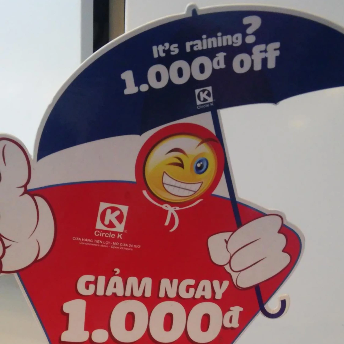첫 번째 장소는 호안끼엠 호숫가의 시장이었습니다. 친구네 아버님의 기사인 Mr.Sun의 자가용은 자동차가 들어갈 수 있을까 싶은 꽤나 시장 안쪽까지 들어가 저와 친구를 내려주었습니다. EBS의 세계견문록에서 백종원 셰프님이 다녀온 하노이 편을 보고 온 터라 이곳이 맛집들의 성지일 거야 라는 느낌이 막 스멀스멀 올라왔죠. 그렇지만 차에서 내리고 얼마 후 다짜고짜 비가 내리기 시작했습니다. 서클 K 편의점에서 급하게 우비를 샀는데, 비가 오니깐 우산을 더 싸게 판다는 문구가 붙어 있었습니다. 왠지 경제학 이론을 거꾸로 가는 것 같지만 기분이 좋아지는 문구입니다.