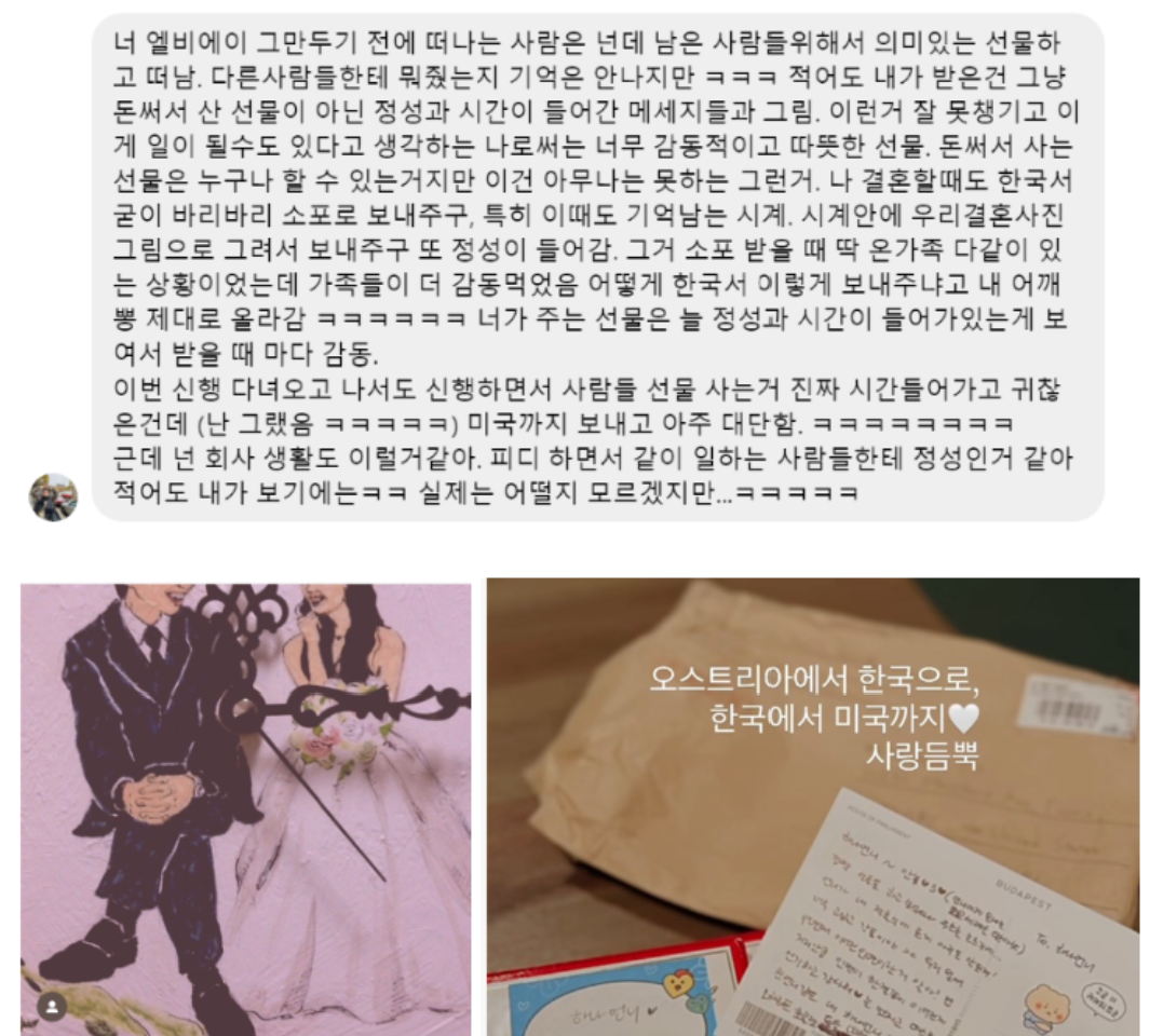 회사 동료) 퇴사했는데도 불구하고 결혼식날 그림과 함께 등장해 줘서 더 반갑고 고마웠던 선물이에요!