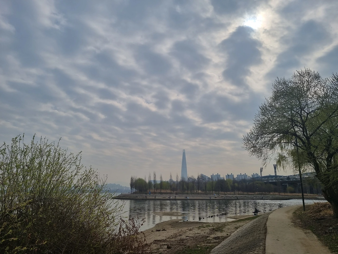 낚시에 열중하는 한 낚시꾼의 뒷모습과 롯데타워를 같이 담아 사진을 찍고는 마치 고은의 시 <그 꽃>처럼, '내려갈 때 보았네 올라갈 때 보지 못한 그 꽃'이 생각나서 웃었다.