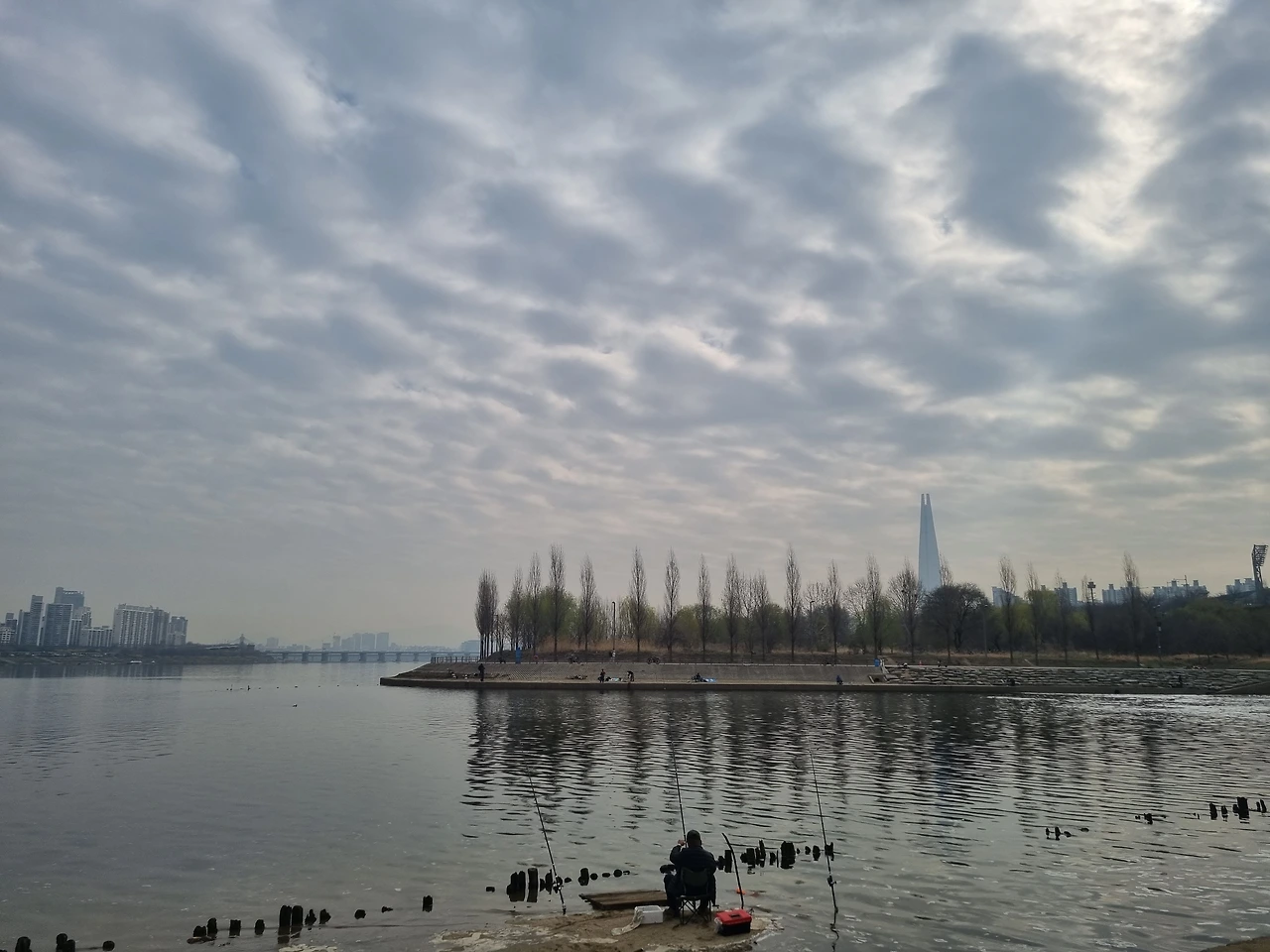 돌아 나오는데, 평소 그냥 스쳐 지나갔던 풍경이 눈에 들어왔다. 세월을 낚는 수많은 낚시꾼들이 터를 잡고 시간을 보내고 있었고, 멀리 보이는 롯데타워와 상당히 이질적인 모습이 연출되었다.